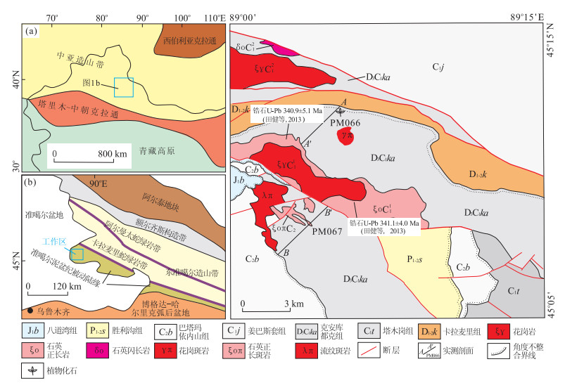 在东准噶尔卡拉麦里地区的五彩湾一带出露一套具磨拉石特征的火山沉积建造, 下部为具磨拉石特征的砾岩、砂岩, 上部为一套中基性的火山熔岩夹中酸性的火山凝灰岩.1:20万卡拉麦里山幅将其归入下石炭统松喀尔苏组.通过1:5万地质调查研究发现, 该火山沉积建造底部以一套粗砾岩高角度不整合于下-中泥盆统卡拉麦里组之上, 含晚泥盆世植物化石Prelepidodendron sp.(先鳞木), 中上部火山岩LA-ICP-MS锆石U-Pb年龄为346.8±3.3 Ma, 且被年龄为341.1±4.0 Ma~340.9±5.1 Ma后碰撞花岗岩侵入, 表明其形成时代为晚泥盆世-早石炭世, 时代上对应于北准噶尔地层分区的上泥盆统克安库都克组.该套地层中上部的火山岩的岩石组合为玄武岩、玄武安山岩、夹少量的流纹质凝灰岩, 岩石化学特征上属钙碱性-高钾钙碱性系列, (La/Yb)N=2.97~6.66, Nb、Ta亏损, 部分样品Zr、Ti弱显亏损, Nb/U、Ce/Pb比值分别为7.43~20.88、3.17~12.45.地球化学特征表明其兼具板内火山岩和弧火山岩的某些特点, 形成于后碰撞伸展环境, 是卡拉麦里洋盆于晚泥盆世之前闭合后后碰撞岩浆活动的产物.这一研究成果对广为关注的卡拉麦里洋盆的闭合时间进行了很好的限定.