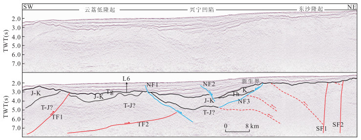 地震资料显示南海北部中生界发育褶皱和逆冲断层等挤压构造, 但目前对其成因仍存在争议.通过对南海北部珠江口盆地东南部陆坡的二维地震剖面进行研究, 发现在云荔低隆起-兴荔凸起-兴宁凹陷一带存在2条近NW-SE走向并往NE方向逆冲的逆断层, 在东沙隆起南部有2条近南-北走向并具有压扭性质的走滑断层, 上述4条断层的平面延伸距离分别约为130、110、55和58 km.综合分析可知, 现今位于南海南部的礼乐-巴拉望地块经中侏罗世-早白垩世与华南陆缘发生软碰撞后, 在晚白垩世与华南陆缘在现今荔湾-兴宁凹陷一带进行最后的"焊接缝合", 而上述4条断层可作为该次"焊接缝合"的间接证据.由于太平洋向华南的俯冲板片在晚白垩世发生了后撤, 华南大陆边缘在晚白垩世末开始张裂之前可能整体为区域均衡抬升、局部陆-陆碰撞缝合的构造格局.