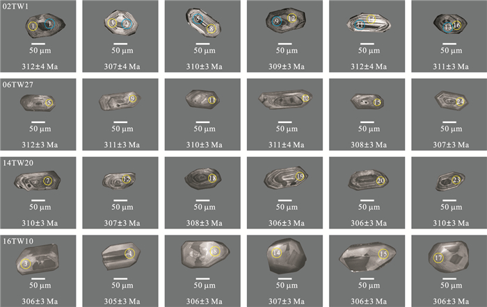 淡色花岗岩对深入理解造山带构造演化具有重要意义.哈尔里克山南麓小铺地区出露多种类型的淡色花岗岩脉,包括黑云母花岗岩、二云母花岗岩、含电气石花岗岩以及含石榴石花岗岩.岩石地球化学研究显示这些淡色花岗岩整体具有高硅(SiO2=73.22%~75.12%)、铝(Al2O3=13.59%~14.49%)、碱(ALK=7.11%~9.67%),低钛(TiO2=0.01%~0.14%)、铁(TFeO=0.26%~1.37%)、镁(MgO=0.09%~0.46%)、钙(CaO=0.46%~1.92%)的特点,属于弱过铝质钙碱性-钾玄岩系列岩石.其中黑云母花岗岩具有较高的CaO/Na2O比值(0.46~0.47)和低的Rb/Sr比值(0.31~0.33),指示其为砂质源岩经黑云母脱水熔融形成;二云母花岗岩和含电气石花岗岩具有较低的CaO/Na2O比值(0.11~0.31)和高的Rb/Sr比值(1.41~3.75),为泥质源岩经白云母脱水熔融形成;含石榴石花岗岩具有强烈的Eu负异常以及"海鸥状"稀土配分模式,为高分异型花岗岩.小铺淡色花岗岩初始岩浆温度较低(T=637~744℃),结合其野外地质特征,认为其形成可能与深部物质的折返、造山带的伸展垮塌有关.利用LA-ICP-MS微区原位锆石U-Pb定年获得黑云母花岗岩的形成时代为308.5±2.2 Ma,含电气石花岗岩的形成时代为307.8±2.3 Ma,二者在误差范围内近乎一致,指示哈尔里克地区在晚石炭世末处于伸展构造背景.