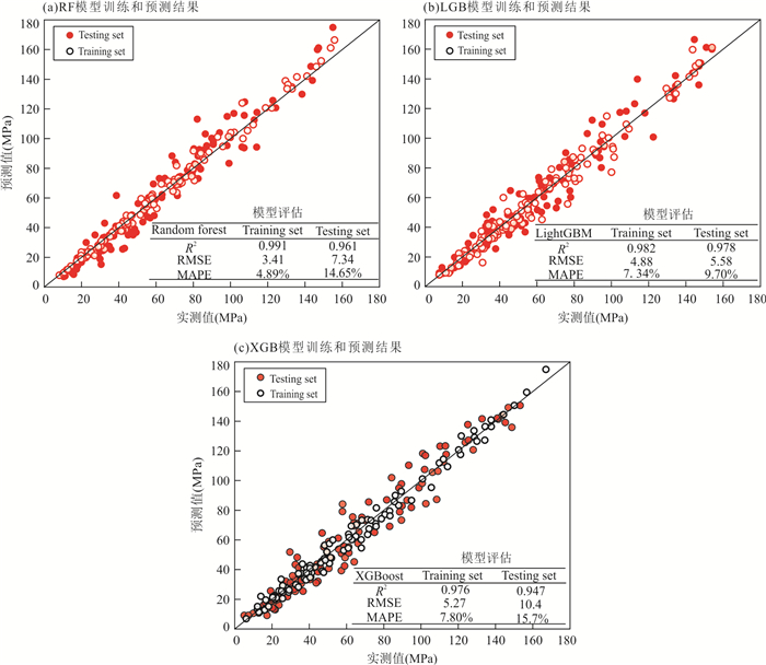 岩石抗压强度是评估岩体工程稳定性的重要力学参数,传统统计回归方法对于岩石抗压强度预测存在一定的局限性.为此,提出了一种利用简单岩石力学参数实现岩石抗压强度智能预测的方法,首先收集了620组含不同类型岩石的三轴试验数据,然后分别采用随机森林(Random Forest,RF)、极限梯度提升树(XGBoost,XGB)和轻量梯度提升机(LightGBM,LGB)3种主流的集成学习算法建立了岩石抗压强度预测模型,使用贝叶斯优化算法在模型训练过程中进行超参数优化,最后利用决定系数(R2)、平均绝对百分比误差(MAPE)和均方根误差(RMSE)对优化后模型的泛化能力进行了综合评估和对比分析.此外,利用LGB模型对输入特征进行重要性分析,以评估不同输入特征对模型泛化性能的影响重要程度.研究结果表明:所建立的3种模型对岩石抗压强度均取得了较好的预测结果,其中LGB模型泛化性能优于另外两种模型(R2=0.978,RMSE=5.58,MAPE=9.70%),且运行耗时相对最少.弹性模量(E)、围压(σ3)和密度(ρ)对模型的泛化性能影响较大,泊松比(v)影响较小.提出的预测模型对于岩石抗压强度预测有良好的适用性,为机器学习与岩土工程的结合提供了新的思路.