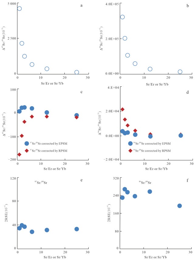 稀土元素二价离子(REE2+)干扰校正是激光原位Sr同位素分析的难点.本研究将一种改进的MC-ICP-MS法拉第杯结构(能同步接收REE2+)与常规的干扰信号扣除法(RPSM)相结合,创新性实现了REE2+干扰的准确校正.系统评估了改进的法拉第杯结构(IFCC)对REE2+信号同步性以及比值(r:166,168,170Er2+/167Er2+和170,172,174,176Yb2+/173Yb2+)的影响.在IFCC上没有观察到REE2+信号之间的脱耦现象,表明IFCC适合与RPSM结合用于REE2+干扰校正;REE2+信号比值(r)与Er和Yb的天然同位素丰度比值(R:166,168,170Er/167Er和170,172,174,176Yb/173Yb)近似相等(r/R≈1),指示在一定条件下可以使用R和测量的167Er2+和173Yb2+信号准确计算出166,168,170Er2+和170,172,174,176Yb2+信号强度,进而实现REE2+干扰校正.加标溶液的Sr同位素SN-MC-ICP-MS分析结果表明,与IFCC结合,常规的干扰信号扣除法(RPSM,使用R做干扰校正系数)可有效校正Sr/Er≥3样品中的REE2+干扰,而增强的干扰信号扣除法(EPSM,使用测量的REE2+信号比值做干扰校正系数)可有效校正Sr/Er≥1样品中的REE2+干扰.应用IFCC,使用LA-MC-ICP-MS对两个富稀土元素磷灰石标准物质Durango(Sr/Er=7.4)和UWA-1(Sr/Er=2.8)进行了Sr同位素组成分析,87Sr/86Sr的测定值分别为0.706 27±0.000 14(2SD,n=19)和0.704 76±0.000 19(2SD,n=20),与报道的TIMS或MC-ICP-MS测定值在误差范围内一致,证实了该方法的可靠性.