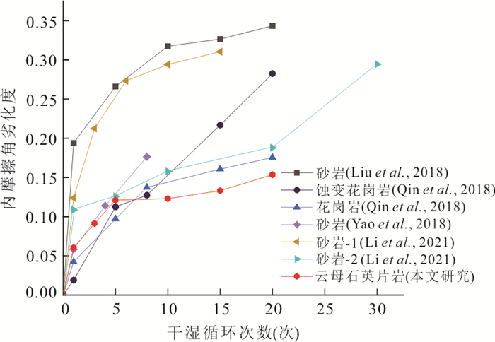 在干湿循环作用下,片岩的抗剪性能劣化对片岩边坡长期稳定性具有重要影响.以鄂西北广泛分布的云母石英片岩为研究对象,通过开展一系列室内试验,揭示其抗剪性能劣化规律及机理.吸水性试验及直剪试验结果表明,云母石英片岩的吸水率随着干湿循环次数增加呈逐渐上升的趋势,抗剪强度及残余抗剪强度随干湿循环次数的增加呈逐渐下降的趋势,抗剪性能劣化效应明显.结合扫描电镜测试所得云母石英片岩微观结构变化规律,揭示其抗剪性能劣化机理:干湿循环作用下,云母石英片岩片理面逐渐扩展开裂,内部矿物颗粒强度软化,颗粒间胶结弱化,岩石骨架变得松散;粘聚力主要受矿物颗粒之间的胶结程度影响,劣化速率较快;内摩擦角主要受矿物颗粒嵌固程度和颗粒本身强度的影响,劣化速度相对较慢.