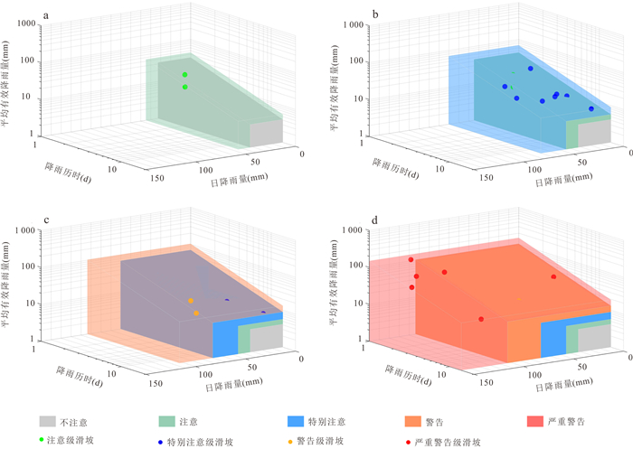 建立滑坡灾害多维度气象预警判据和划分“网格化”预警单元能够为滑坡灾害气象预警提供科学依据.本文以浙江省金华市磐安县205个降雨型滑坡为研究对象,首先,基于平均有效降雨强度‒降雨历时(I⁃D)阈值模型,采用普通最小二乘回归(OLSQ)和分位数回归(QR)划分临界阈值曲线;其次,引入当日降雨量(R),进一步优化I⁃D阈值模型,建立I⁃D⁃R阈值模型,采用不同参数估计方法对比不同阈值模型精度,选择最优阈值模型作为磐安县滑坡灾害气象预警判据;最后,基于降雨分布的差异性,在划分地形单元的基础上利用泰森多边形(VD)建立了乡镇级别的“网格化”预警单元.结果显示:(1)I⁃D⁃R阈值模型相比于I⁃D阈值模型具有更好的预警精度,且基于QR的I⁃D⁃R阈值模型效果更好,警告及以上阈值等级精度提升到50%,特别注意及以上阈值等级精度提升到88.9%;(2)采用基于QR的I⁃D⁃R降雨阈值作为磐安县51个预警单元四级气象预警(红、橙、黄、蓝)的判据,并提出相应的应急响应措施.研究成果提供了一种新的阈值模型,能够为磐安县区域气象预警提供借鉴与参考.