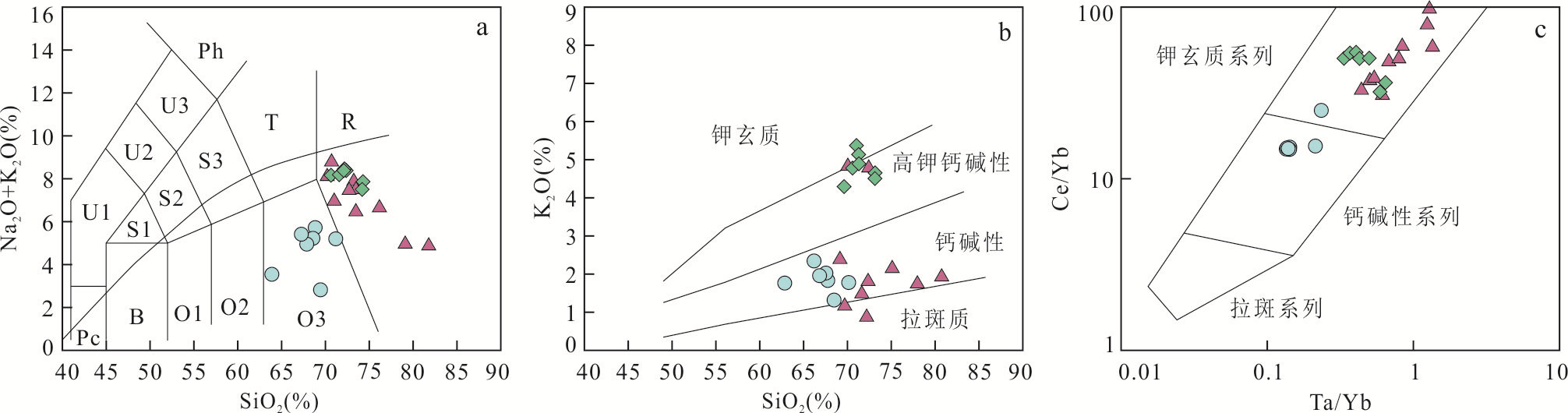 辽北清原地区位于华北板块北缘东段,是研究古太平洋构造域的典型地区之一.研究区中生代岩浆岩的成因及构造背景对认识古太平洋构造域的演化具有重要意义.本次研究对清原夏家堡地区辉长苏长岩、石英闪长岩和花岗闪长岩进行了锆石U-Pb年代学和岩石地球化学分析.锆石U-Pb测年结果表明,辉长苏长岩形成于中侏罗世晚期((163.8±2.4)Ma),石英闪长岩形成于中侏罗世中期((169.9±2.2)Ma),花岗闪长岩形成于中侏罗世中期(169.9~167.3 Ma).岩石地球化学特征上,辉长苏长岩和石英闪长岩属于钙碱性系列岩石,具有低硅、富铝、高镁及较高的Mg#,弱富集轻稀土元素(LREEs),富集Rb、Ba、K、Sr等大离子亲石元素(LILEs),亏损Nb、Ta等高场强元素(HFSEs),Eu呈微弱的正异常或无异常;花岗闪长岩具有较高的硅、铝和全碱含量,具有高钾钙碱性I型花岗岩地球化学特征,Sr/Yb值较高,Eu具弱的负异常,富集LREEs和LILEs(Rb、K、Ba等),亏损HFSEs(Nb、Ta等).上述地球化学特征表明辉长苏长岩和石英闪长岩的原始岩浆应起源于受俯冲板片析出流体所交代的岩石圈地幔部分熔融;花岗闪长岩是俯冲背景下受流体交代的下地壳基性火成岩部分熔融的产物.结合区域构造演化史和区域岩浆活动时空分布规律,认为辽北清原夏家堡地区中侏罗世侵入体的形成与古太平洋板块的俯冲作用有关.
