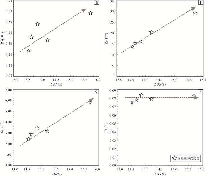 蛇纹岩中的锆石不仅可以提供年代学信息,还可以约束蛇纹岩的成因和区域构造演化过程.本文以唐加‒松多古特提斯缝合带中的龙崖松多蛇纹岩为研究对象,对其进行了全岩地球化学、锆石U-Pb年代学和Lu-Hf同位素研究.结果显示,龙崖松多蛇纹岩具较高的MgO和TFeO含量、高Mg#值以及较低的Al2O3和TiO2含量.样品稀土元素配分曲线呈较为宽缓的“U”型.微量元素蛛网图显示,样品富集U、Ta,亏损Th、Nb、Zr和Hf.龙崖松多蛇纹岩锆石U-Pb定年结果为(230.3±2.3)Ma,εHf(t)值在+13.4到+16.0之间.年代学和地球化学研究表明,龙崖松多蛇纹岩的原岩为地幔楔内尖晶石二辉橄榄岩部分熔融后的残留体.龙崖松多蛇纹岩受到松多古特提斯洋板片俯冲产生的超临界流体的交代形成了交代锆石,可能还受到富水流体的交代,导致流体活动性元素的富集.结合前人研究,本文认为松多古特提斯洋在晚三叠世可能尚处于北向俯冲阶段.