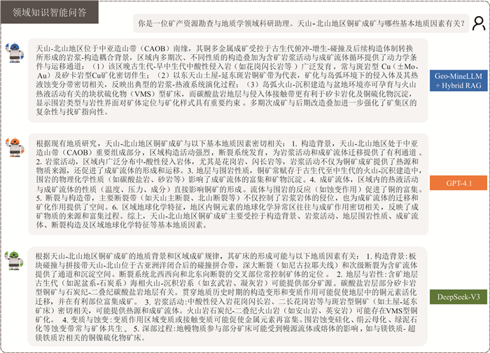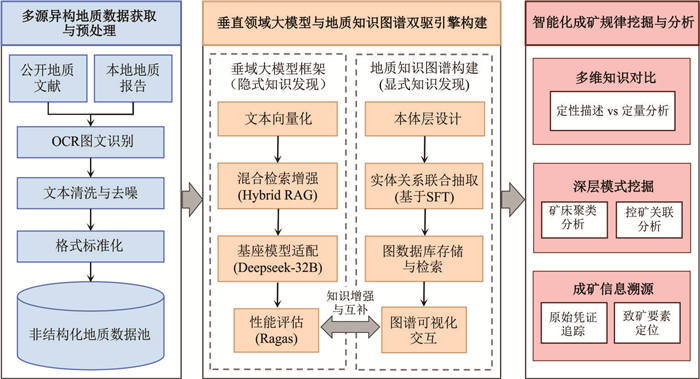 针对地质勘查领域海量非结构化数据难以被有效利用以及通用大模型存在“事实幻觉”与专业逻辑匮乏等问题,本文提出了一种融合知识图谱(KG)与检索增强生成(RAG)的垂直领域智能知识挖掘框架,并以中国黔西南与美国内华达地区的卡林型金矿成矿规律总结和对比研究为例进行了验证.首先,构建了基于本地化部署DeepSeek-32B的RAG智能问答系统,通过向量检索与生成式阅读理解,实现了专业知识的精准溯源与高可信问答.其次,利用大模型监督微调(SFT)技术,从数百份多源异构地质资料中高效构建了系统涵盖地层构造、蚀变矿物及控矿要素的跨区域成矿知识图谱.实验结果表明,该系统在客观准确性上显著优于GPT-4o,在主观生成上具备高忠实度与完全可溯源性,有效解决了幻觉问题.基于图谱拓扑学的分析不仅定量揭示了两地成矿的宏观异同,还量化了从矿石实体、蚀变组合到地球化学元素异常的级联指示路径,证实了其发现隐性找矿线索的能力.该研究实现了从非结构化文本到结构化知识的智能转化与深度挖掘,为解决地学领域“海量数据、知识饥饿”困境提供了新的技术路径.