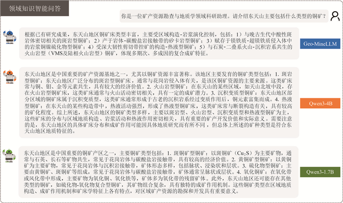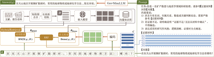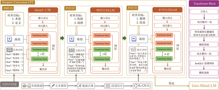 为解决矿产勘查场景下通用大语言模型领域语料稀缺、领域术语覆盖与语体适配不足、事实性幻觉突出的问题,构建约2 500万token规模的领域语料库,在此基础上提出课程式持续预训练策略,按术语、机制、案例三阶段组织训练数据,并配合渐进式Transformer block解冻与学习率调度,对Qwen3-1.7B进行持续预训练以实现分阶段领域适配,得到面向矿产勘查场景的大语言模型Geo-MineLLM;推理阶段集成Hybrid RAG,以混合检索与证据约束生成提升事实一致性.人工评估表明,Geo-MineLLM相较基座模型与同系列更大参数规模的模型能显著提升领域问答表现;集成Hybrid RAG后,综合领域问答表现接近GPT-4.1.该训练、推理一体化方案为矿产勘查领域大模型构建与可靠问答提供了轻量化路径.