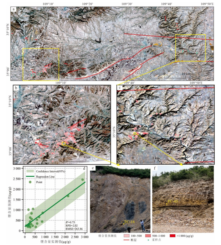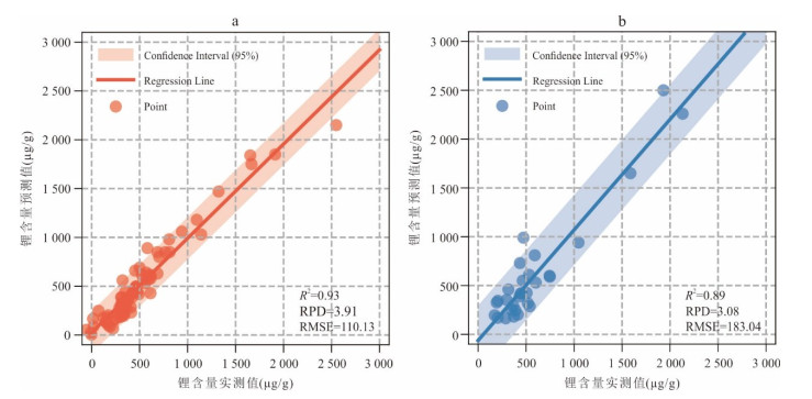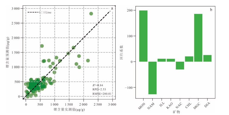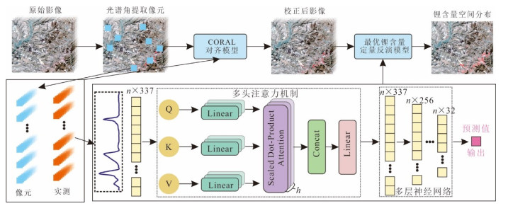为实现基于卫星高光谱影像的锂含量空间分布制图以支持找矿工作,以富锂黏土岩的实测光谱、XRD(X-ray Diffraction)、锂含量及ZY1-02D高光谱影像为基础,采用多算法结合的技术路线,构建锂含量反演模型.通过ETNN(Ensemble Transformer Neural Network)回归算法建立定量反演模型,结合SSEE-SAM(Spatial Spectral Endmember Extraction-Spectral Angle Mapper)识别矿化露头,并采用CORAL(CORrelation Alignment)进行光谱域校正,然后应用最优模型生成锂含量空间分布图.训练集R2=0.93、RPD=3.91、RMSE=110.13,测试集R2=0.89、RPD=3.08、RMSE=183.04,表明模型具有较高准确性和较强拟合能力;野外验证集R2=0.75、RPD=2.02、RMSE=263.86,表明模型具有很强的泛化能力.相关系数表明锂与蒙脱石、绿泥石关系最为密切,重要性分析表明2 132~2 350 nm波段为反演模型的关键波段.本研究构建了一套从光谱到锂含量的反演技术体系,可为铜川地区及滇中盆地、黔中盆地黏土型锂矿找矿勘查提供技术支撑.