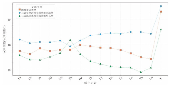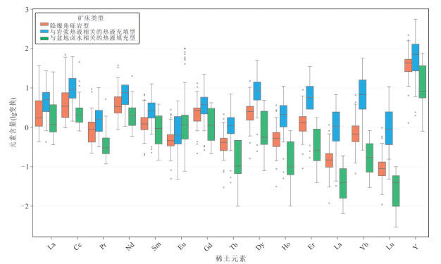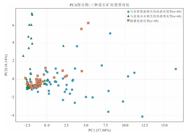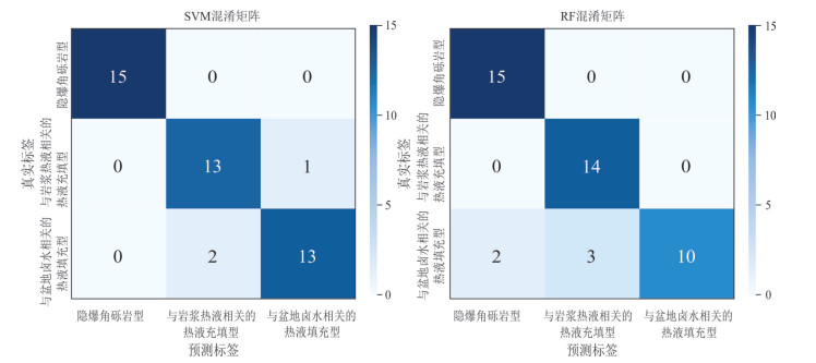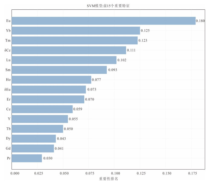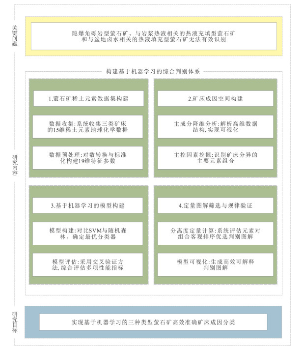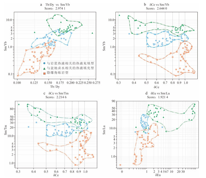 贵州西部萤石矿集区内新识别出的隐爆角砾岩型萤石矿具有巨大的找矿潜力.然而该类型萤石矿角砾状构造、热液蚀变等特征易与其他热液角砾岩型矿床或强烈构造改造的脉型矿床相混淆,如何准确识别研究区内隐爆角砾岩型和与盆地卤水相关热液填充型萤石矿是实现贵州省萤石矿找矿突破的关键科学问题之一.本文通过对系统收集的隐爆角砾岩型、与岩浆热液相关的热液充填型和与盆地卤水相关热液填充型三种成因类型萤石矿的稀土元素数据进行支持向量机和随机森林机器学习分类模型对比研究,并结合基于主成分分析的统计分析、降维可视化和稀土元素分离度评分体系定量评估进行综合研究.结果显示支持向量机构建的判别模型准确率与稳定性均显著优于随机森林,可以更加有效地判别这三种成因类型萤石矿,并识别出可用于区分三种成因类型萤石矿的关键元素精炼候选池,构建出了新的Tb/Dy-Sm/Yb、δCe-Sm/Yb、δCe-Sm/Tm、δEu-Sm/Lu判别图,后续实验也验证了该方法可以有效区分隐爆角砾岩型、与岩浆热液相关的热液充填型和与盆地卤水相关热液填充型萤石矿.
