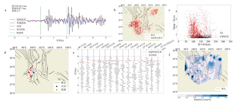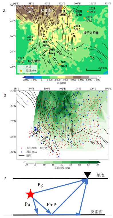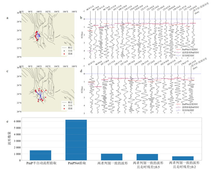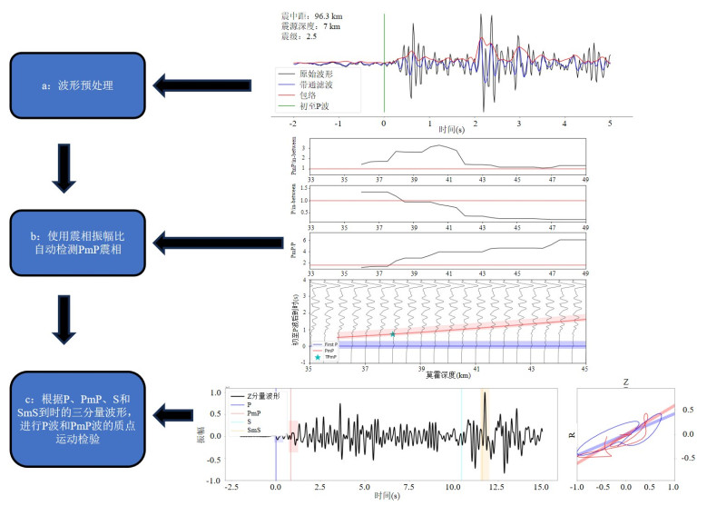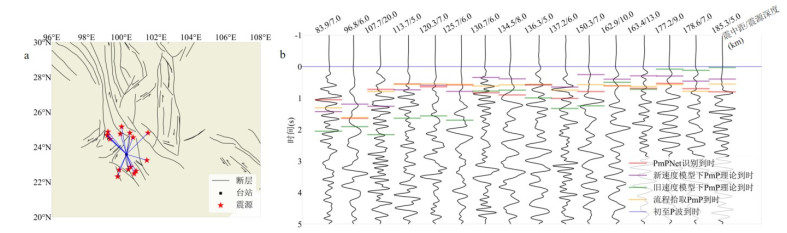 莫霍面反射波PmP的射线路径与初至Pg波、Pn波不同,其传播特性与发震构造环境密切相关,可为研究地壳深部结构与莫霍面不连续性提供关键信息.识别PmP波的主要挑战是它们的稀缺性,且人工拾取需要耗费大量的人力.为改善这一问题,利用青藏高原东南缘的固定台站(2009—2022年)和流动台阵(2011—2013年)记录的波形,通过手动拾取和振幅比值检验得到了1 713个PmP震相,结合半自动拾取流程(基于振幅阈值筛选和质点运动检验)提取1 536个PmP震相,构建了高质量PmP数据集.对基于深度神经网络的PmPNet进行重新训练,构建了适配青藏高原东南缘的新模型PmPNet-SET_V1.0和PmP-traveltime-Net-SET_V1.0,其中PmPNet-SET_V1.0模型的F1分数为0.863 7,精确率为86.6%,召回率为84.8%,并将该区域内高质量PmP波数量增加至6 268个.所有PmP拾取结果通过严格的人工检验并与理论走时对比,确保了可靠性.研究表明,训练参数对采集波形的数量和质量具有显著影响.此外,基于所构建的PmP数据集,本研究初步获得了青藏高原东南缘区域莫霍深度分布,其呈现西北深,东南浅的趋势,与前人反演结果的样式相近.