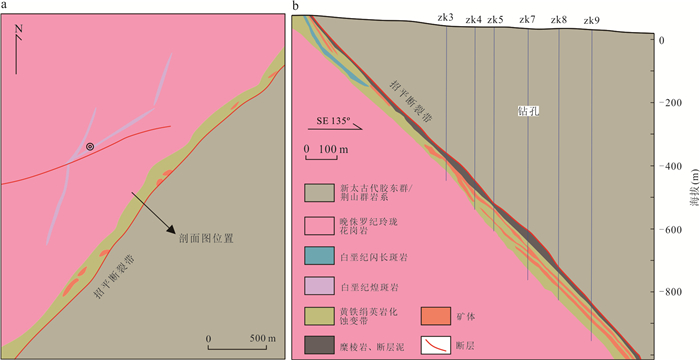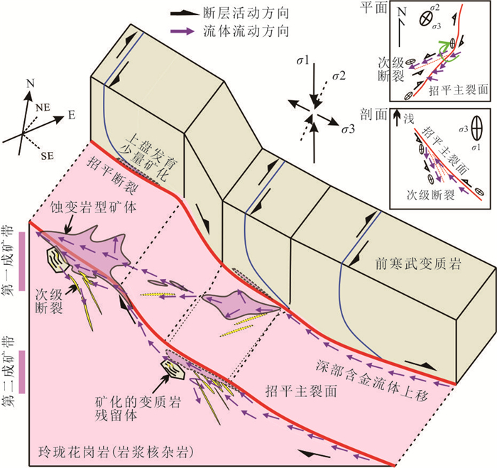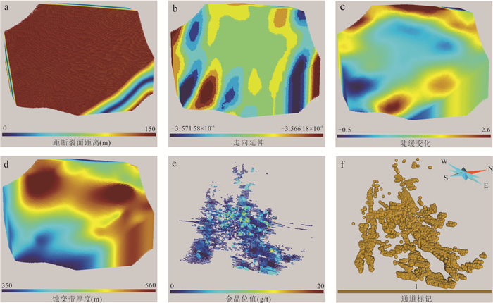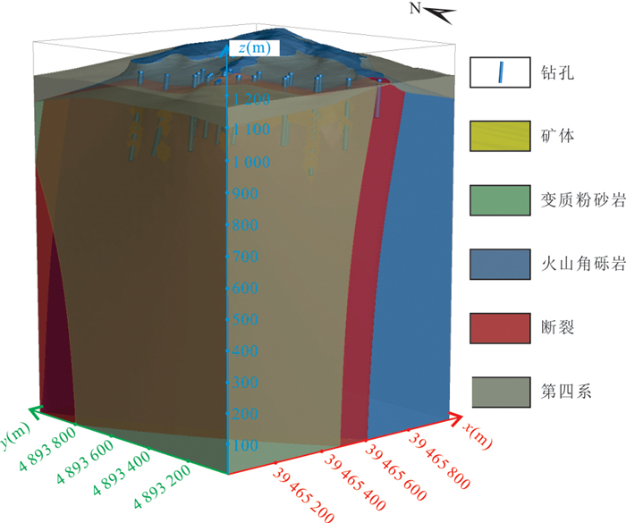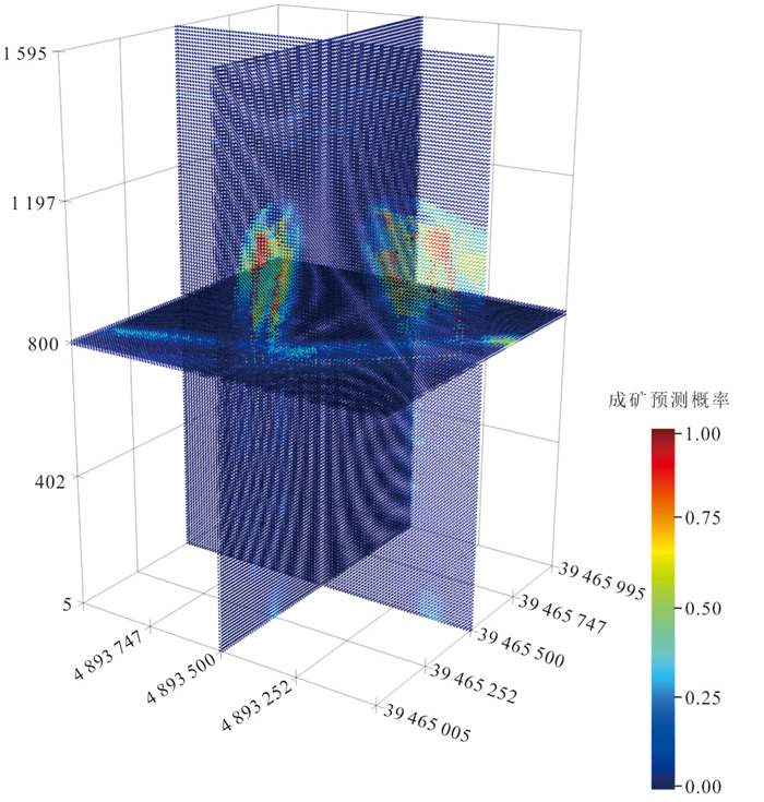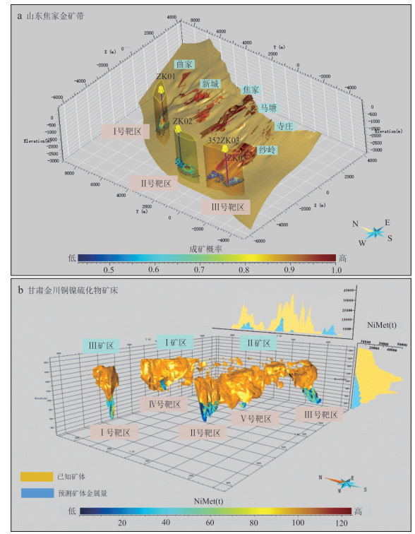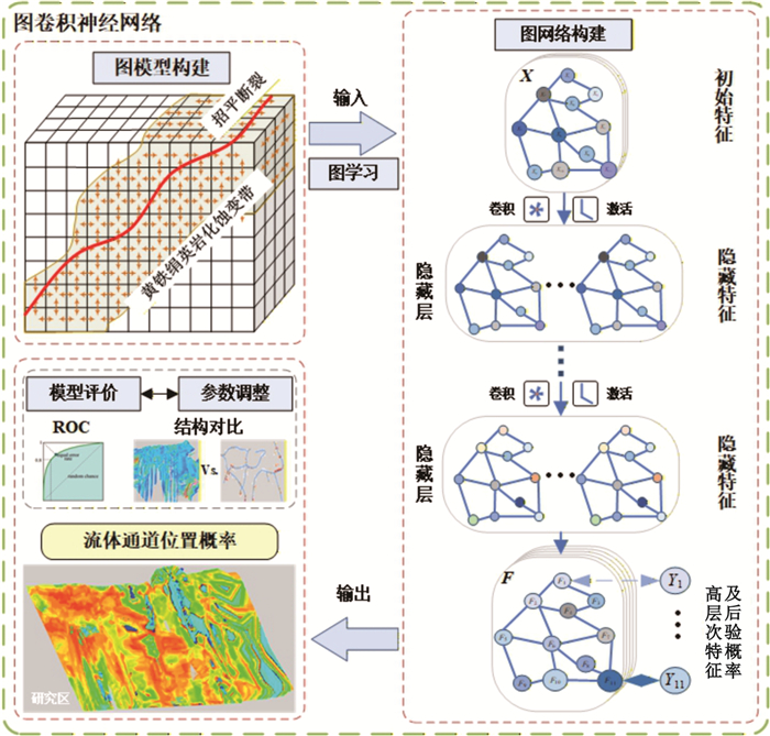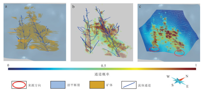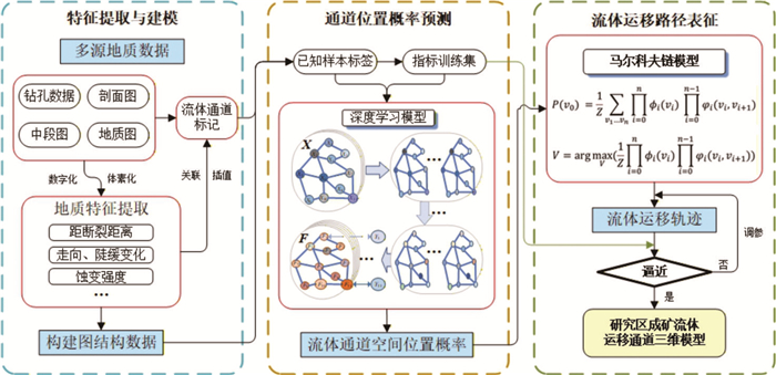 热液成矿流体运移通道控制了热液流体的空间运移与汇聚成矿,三维重建流体通道对理解矿床成因、开展找矿预测至关重要.然而现有研究受限于采样成本高昂、研究方法定性和地质特征复杂,难以在矿床尺度重建成矿流体运移通道三维结构.本研究以胶东夏甸金矿床为研究对象,设计了一种知识‒数据协同驱动的流体通道三维重建方法框架.该框架基于矿床地质调查、勘查数据(例如钻孔、中段编录数据)确定流体通道识别标志,通过图卷积深度网络模型构建流体通道空间概率分布模型,基于马尔科夫链模型定量表征三维成矿流体运移通道.实验结果表明:(1)该模型在小样本数据条件下表现出优异的特征识别能力(AUC=0.956 9),推断的流体运移通道高概率区域与成矿流体流动认识相符;(2)夏甸金矿成矿流体来源于深部,沿招平断裂带向上呈分支扩散状运移;(3)主干流体通道分布主要受招平断裂深部产状变化控制,而密集发育的次级通道网络受次级断裂、节理、裂隙等构造控制,反映了流体运移、矿质沉淀的协同控矿作用.本研究为理解构造‒流体‒矿化耦合机制提供了新视角,揭示了夏甸金矿“主干通道运移‒分支末端沉淀”的流体流动模式,基于流体运移通道特征圈定了夏甸金矿深部2处成矿有利区.