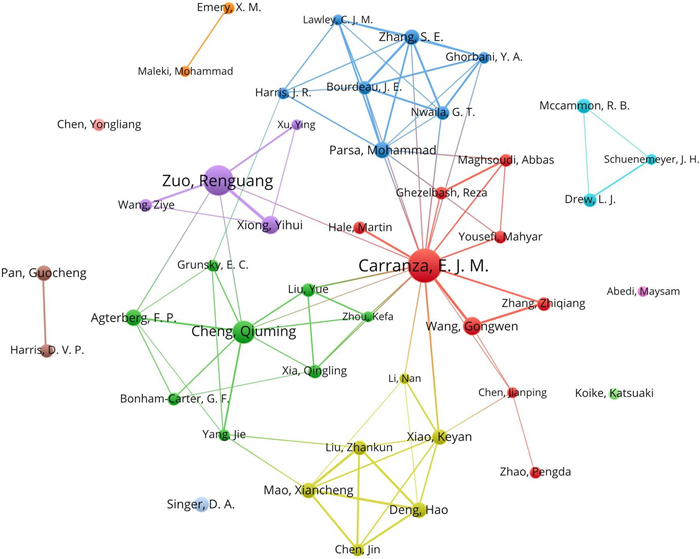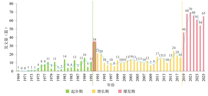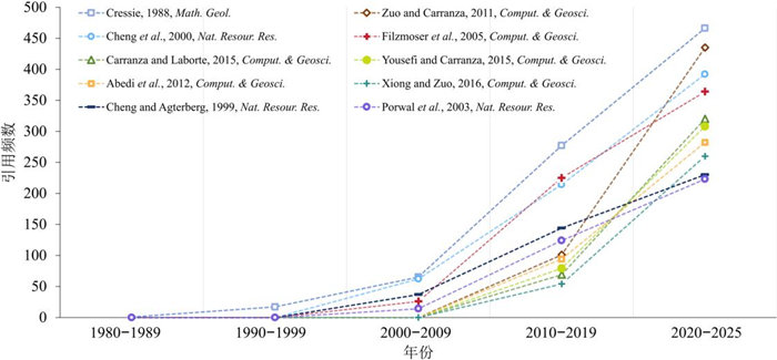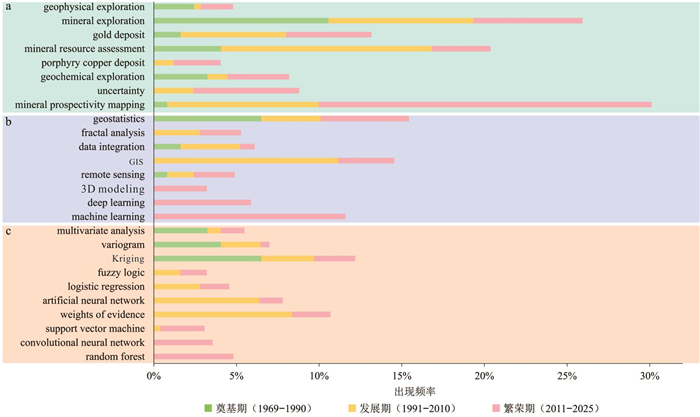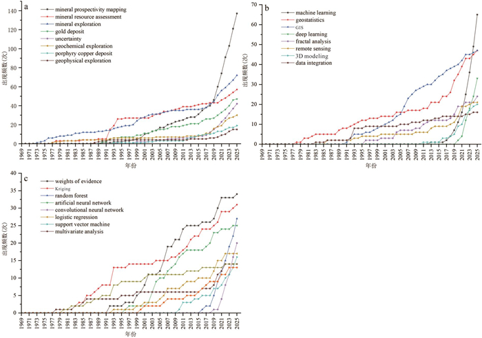 矿产勘查是护航国家资源安全与产业供应链稳定的基础性工作,作为矿产勘查的核心环节,矿产预测在大数据与人工智能技术的助推下已实现跨越式发展,成为地球科学中的热门研究领域,积累了大量的研究文献.本文采用文献计量学方法,以国际数学地球科学学会三本会刊在1969年至2025年间发表的935篇矿产预测主题论文为数据源,分析和探讨了矿产预测近五十多年的研究现状、发展轨迹与热点变迁.文献作者、机构和国别的统计结果表明,Carranza E.J.M.和左仁广分别以署名作者和第一/通讯作者的身份成为本领域最高产和高被引的学者,中国是矿产预测领域最大的论文产出国,中国地质大学(武汉)的发文量和总被引频次在全球机构中位居榜首,本研究领域的合作存在较强的地域导向性,高水平、常态化的国际协同研究网络尚未形成.根据关键词的热点变迁将矿产预测研究分为奠基期(1969-1990年)、发展期(1991-2010年)和繁荣期(2011-2025年),不同时期的主题任务和发展轨迹取决于该时代热门技术和算法的发展水平.奠基期是以矿产资源评价任务为主的阶段,对应了地质统计学(变异函数和克里金插值)热度遥遥领先的时期;发展期GIS技术的兴起和广泛应用助力了矿产预测逐渐替代矿产资源评价成为主流科学任务,而繁荣期机器学习算法的盛行则让矿产智能预测成为热度断档领先的研究主题.矿产预测研究最新的热点和发展趋势是从倚重单一高性能预测模型,转向对智能预测模型内部机制的深入探索与优化,利用前沿人工智能技术解决决策过程黑箱属性和样本稀缺等矿产预测的固有瓶颈问题.优越的深度学习算法近年来收获了最高的热度,但经典的浅层学习算法,如擅长处理高维数据及非线性问题的支持向量机和具有强大抗过拟合能力的随机森林,依然因其高度适配小样本矿产预测任务而成为繁荣期本领域学者的热门选择.本研究借助量化统计分析和可视化工具,不仅为理解矿产预测的学科发展脉络提供了宏观和全面的视角,也为把握本领域未来智能预测发展方向提供了参考.