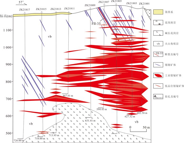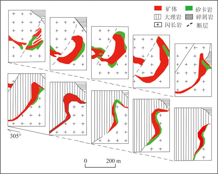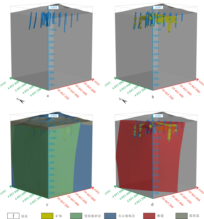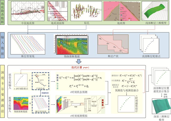 为了解决金属矿山深部直接观测缺乏、间接观测不确定性高,深部构造难以精细化三维重建的问题,利用先验知识弥补数据缺陷,研发了深度卡尔曼滤波法.基于卡尔曼滤波的思想,将由浅部到深部的断层三维建模视为“时序预测”问题:(1)结合浅部断层和产状约束,构建预测深部断层位置的状态方程;(2)借助物探推断数据和卷积网络代替观测,构建观测方程.通过融合预测和观测结果,实现深部断层位置的最优推断.该模型在夏甸金矿的应用表明:建模结果在深部钻孔揭露的断裂位置平均水平误差为6.17 m,精度较隐式建模方法提升91%~93%,能更准确反映深部断层的精细形态特征.基于重建的模型,在夏甸矿区深部圈定出四个成矿潜力区,可为后续资源勘查提供指导.