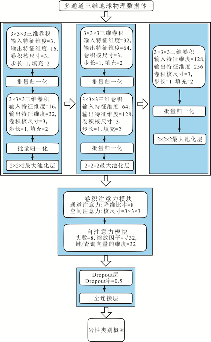 矿田尺度深部地质结构“透明化”是矿产勘查与成矿预测的核心,三维岩性建模是实现这一目标的关键技术.然而,当前矿田尺度三维岩性建模主要依赖效率较低的显式建模方法,难以满足多阶段矿产勘查和矿山实时生产的需求,因此亟须研发高精度、高效率的三维岩性隐式建模方法.针对上述问题,本研究以三维卷积神经网络(3D Convolutional Neural Network,3D CNN)为基础,融合卷积注意力机制(Convolutional Block Attention Module,CBAM)与自注意力机制(Self-Attention Module,SAM)构建混合注意力机制深度学习算法(Hybrid Attentional Mechanism deep learning model,HAM),并基于该算法挖掘多源地质‒地球物理数据中的深层次特征,确定建模所需地质体边界,实现既能捕捉局部上下文、又能表征全局上下文的三维岩性隐式建模方法.为验证HAM算法有效性,本研究选择胶东半岛焦家金矿田作为研究区,开展对比实验与消融实验.结果表明,相较于随机森林(Random Forest,RF)和3D CNN等基线算法,本次研究提出的HAM算法在三维岩性建模的准确率、宏平均精确率、召回率、宏平均F1分数和混淆矩阵上表现出显著优势,对推动深部找矿和矿山生产具有重要意义.