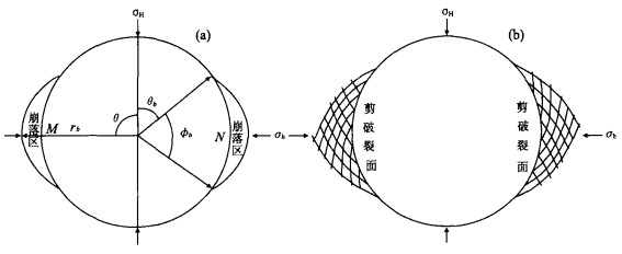 a.崩落区位置; b.压应力集中区剪切破裂面; θb.崩落角; φb.崩落跨度或崩落张角; σH.最大水平主应力; σh.最小水平主应力; rb.崩落深度; θ.最大水平主应力方向与崩落区的夹角