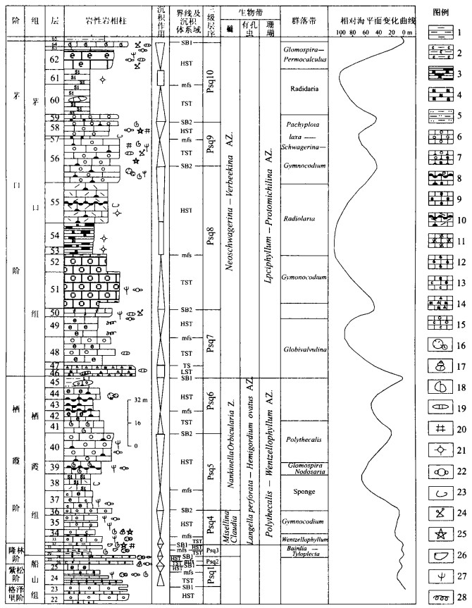 按新近国际年代地层划分方案(ICS, 2000), 下扬子区二叠纪地层自下向上分为3统、9阶和相对应的华南传统6阶划分.二叠系从阿瑟尔阶至长兴阶(44 Ma)共划分出14个三级层序, 每个三级层序平均时限约为3.14 Ma, 其中“紫松阶”(相当阿瑟尔+2/3萨克马尔阶)1个(船山组中上部)、“隆林阶”(相当1/3萨克马尔阶+阿丁斯克阶)2个(分别对应船山组上部和梁山组或镇江组)、“栖霞阶”(相当库班甘德阶+1/3罗德阶)3个(栖霞组)、“茅口阶”(相当于2/3罗德阶+沃德阶+卡皮丹阶)4个(孤峰组、茅口组、堰桥组、银屏组和武穴组)、吴家坪阶2个(龙潭组或吴家坪组)、长兴阶2个(长兴组或大隆组); 共归并为4个层序组(sequence set).