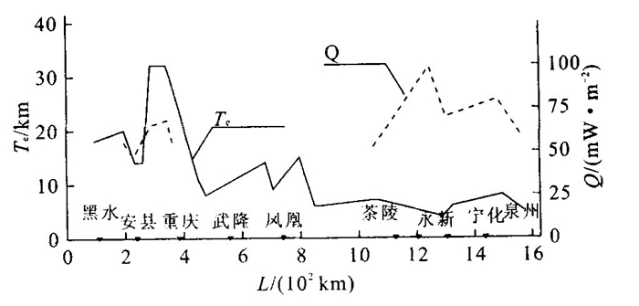 大陆岩石圈有效弹性厚度(Te) 是表示岩石圈强度的参数, 计算该参数对研究岩石圈大规模构造, 分析大陆板块内的均衡补偿机制有一定意义.利用Forsyth提出的相关技术计算了北冰洋-欧亚大陆-太平洋地学断面东南段自黑水到泉州的Te值.并分析了重力和地形波长的相关性特征, 初步认为: 计算Te值所选的每个数据块在短波长(6.6~ 10 0km) 内岩石圈板块的强度足以平衡地形负载, 重力和地形不相关; 在长波长(10 0~ 2 5 0km) 内, 地形及地下负载由弯曲模型补偿, 岩石圈板块在地形及地下负载作用下而挠曲.断面通过地段具有较低热流密度值的四川陆核有较高的Te值, 具有较高热流密度值的宁化、大田地区有较低的Te值, 反映了较高的热流密度值对应较低的Te值; 较低的热流密度值对应较高Te值的关系.Te可分为南东低值段和北西高值段.地壳厚度大体上与Te值呈正相关关系.