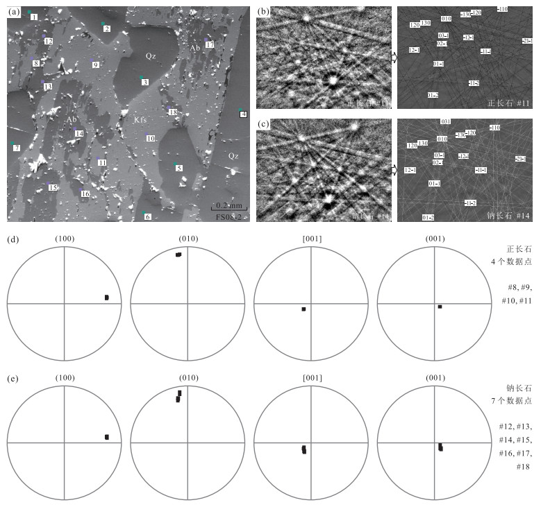 文象花岗岩具有特殊文象结构,研究其三维拓扑结构和形成过程有助于了解花岗质岩石的结晶作用.以北京周口店房山岩体和湖北罗田蕙兰山的文象花岗岩为研究对象,综合利用光学显微镜、扫描电镜、电子探针和电子背散射衍射等技术方法,对岩石矿物组成、结晶学取向和拓扑结构进行了系统研究.结果表明:(1) 文象花岗岩的矿物组成与其形成地质环境有关,石英和长石的含量变化范围很大,其中石英含量通常在20%~45%,但是相同地区同期形成的文象花岗岩具有相对稳定的矿物组成;(2) 长石作为寄主矿物通常呈半自形-自形粗大晶体,可以是碱性长石或斜长石,其端元组分以钾长石和钠长石为主,低温下常分解为条纹长石;(3) 石英在长石寄主矿物中规则穿插生长,在三维空间通常呈近似平行板状、长条状/柱状或非连通枝杈状,并只在特定岩石断面形似象形文字;(4) 正交偏光显微镜下,石英可以具有多种消光位,但是通常在一定范围内同时消光;(5) 石英普遍发育道芬双晶,偶见日本双晶;(6) 条纹长石中钾长石与钠长石对应(100)、(010)、(001) 面和[001]轴近似平行;(7) 多数石英颗粒与寄主长石之间具有密切结晶学取向关系,即石英[1123]轴近似平行长石c[001]轴.该研究证实文象花岗岩是石英和长石同时生长的结果,而长石作为寄主矿物影响并控制着石英的成核与生长方向.