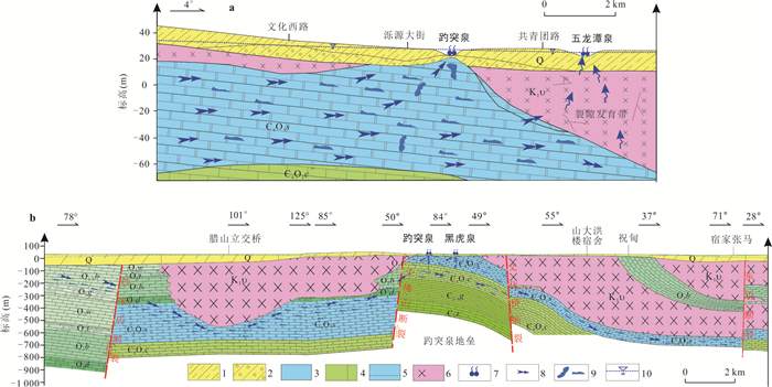 岩溶地下水和地热水分别是中国北方重要的供水水源和供暖热源,但二者水力联系尚缺乏系统研究;为实现保泉、供水和地热清洁能源开发的三赢,通过含水层/热储层空间分布、同位素测年、水文地球化学场、水动力场、温度场特征及规律分析等方法,揭示了趵突泉泉域岩溶地下水流系统从浅、中循环子系统至深循环子系统,即岩溶地下水至冷泉和热泉的演变过程、驱动机制与响应机理. 在地下水位高程差引起的重力势能差驱动下,岩溶地下水沿济南含水层系统从上游浅循环-开放式地下水动力系统,向中游中循环-半开放式地下水动力系统径流,径流途中在济南市区遇不透水的辉长岩体或石炭纪二叠纪砂岩页岩地层阻截,大部分地下水沿垂向强裂隙岩溶发育通道上涌、穿透第四纪砾岩或辉长岩体裂隙发育带喷出地表形成17~18 ℃的承压上升冷泉. 一小部分地下水从深部穿过或从侧面绕过辉长岩体,沿裂隙岩溶通道继续向下游深循环运移,形成弱开放地热水动力系统;高大地热流传导聚热、深大断裂带/侵入岩体-灰岩接触带带状对流聚热、凸起区高热导率分流聚热、盖层低热导率保温聚热、地下水深循环运移传导-对流聚热等五元聚热驱动14~18 ℃的常温地下水演变为33~95℃的承压热泉(自流地热水).