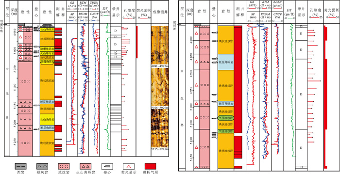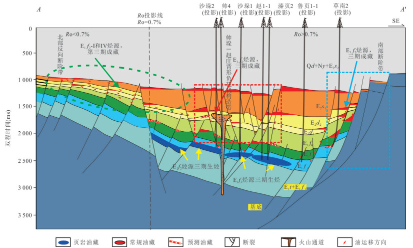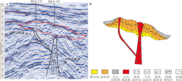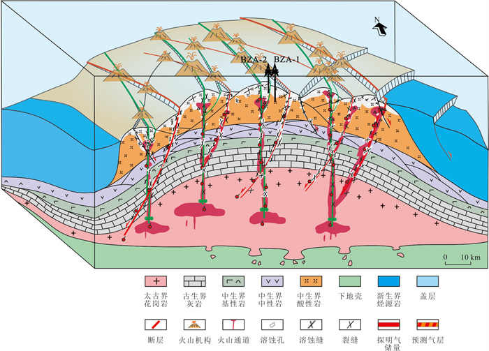 渤海海域广泛发育中生界火山岩,但如何寻找规模型火山岩油气藏,一直以来是渤海深层潜山油气勘探的热点和难点.为了明确规模成藏的主控因素,以渤海海域新近获得重大勘探突破的渤中A构造中生界火山岩为研究靶区,利用钻测井资料、壁心及薄片观察、岩石地球化学等分析测试资料,结合三维地震,分析了中生界火山岩岩性岩相、火山机构类型、储集空间特征及油气成藏主控因素.研究表明,渤中A构造自下而上发育基性、中性和酸性3个火山岩旋回,其中晚期旋回由多个大中型酸性熔岩火山机构叠置构成,主要发育溢流相气孔流纹岩和块状流纹岩以及火山通道相的流纹质隐爆角砾岩等3大类岩性,具备发育优质火山岩储层的岩性岩相基础;火山岩原生孔隙占比较低,强构造活动和多类流体溶蚀等后期次生改造作用控制发育大量构造裂缝及溶蚀孔缝,储层垂向分为表层风化溶蚀带和内幕裂缝溶蚀带双层储层结构,整体为高孔渗的规模性优质缝溶体;高孔渗酸性火山岩缝溶体、古隆起背斜圈闭、紧邻渤中富烃洼陷、上覆厚层超压泥岩与晚期弱构造活动等有利要素是渤中A构造规模性油气成藏的关键条件.在以上研究的基础上,综合建立了研究区超深层规模型中生界火山岩油气成藏模式,可为渤海海域及其他相似地区火山岩油气勘探提供指导.