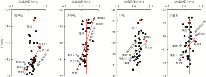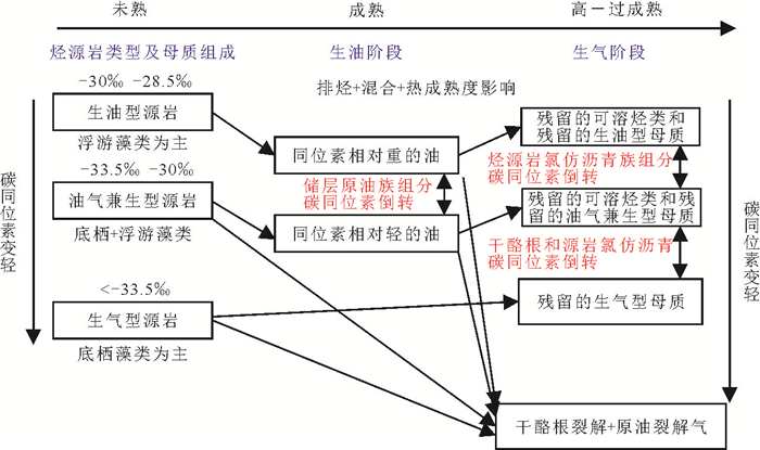 下寒武统玉尔吐斯组烃源岩已经被认为是塔里木盆地台盆区海相油气的主力烃源岩.目前对玉尔吐斯组烃源岩的认识主要基于野外露头和少量隆起区钻井岩心样品分析,而对斜坡和凹陷区烃源岩特征了解较少.理解玉尔吐斯组烃源岩干酪根碳同位素特征对于厘定烃源岩生烃机理及建立油气源对比关系具有重要的参考意义.通过对顺北地区不同断裂带原油和天然气样品开展详细的有机地化及碳同位素地球化学研究,在定量评价热成熟度对原油和天然气碳同位素影响的基础上,恢复了其初始碳同位素组成.利用油气形成过程干酪根与其生成油气组分的碳同位素分馏特点分别恢复了顺北地区奥陶系原油和天然气来源干酪根的碳同位素组成.结果表明:顺北地区生油干酪根碳同位素主要位于-32.3‰~-28.8‰,生气干酪根碳同位素主要位于-33.1‰~-29.8‰,原油和天然气主要来自以底栖藻类和浮游藻类混合生源为主的干酪根,其中原油还存在来自以浮游藻类为主要生源干酪根的贡献.偏轻的干酪根碳同位素特征表明顺北地区油气主要来自玉尔吐斯组烃源岩.根据成烃生物组合的变化,将玉尔吐斯组烃源岩划分为以浮游藻类为主要生源的生油型源岩(δ13C > -30‰)、以底栖和浮游藻类混合生源为主的油气兼生型源岩(-33.5‰ < δ13C < -30‰)及以底栖藻类为主要生源的生气型源岩(δ13C < -33.5‰).随着烃源岩热成熟度的增加,早期以浮游藻类生油为主,而晚期底栖藻类生成油(主要为挥发油-凝析油)的贡献增加,从而导致早期生成油同位素偏重,而晚期生成油具有相对偏轻的碳同位素特征;同时,生油干酪根含量逐渐减小,而生气干酪根相对含量逐渐增加,导致烃源岩中干酪根总体碳同位素逐渐变轻.因此,不同烃源岩类型及不同生源干酪根差异生烃过程导致了玉尔吐斯组烃源岩生成的油气具有复杂的碳同位素特征(如储层原油族组分碳同位素倒转、烃源岩氯仿抽提物与干酪根碳同位素倒转等).研究结果可为塔里木盆地超深层油气相态预测提供新的约束.