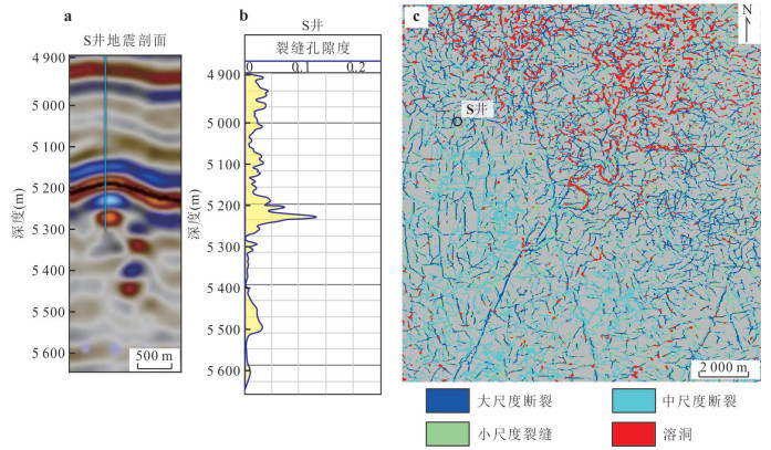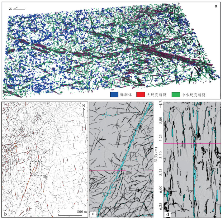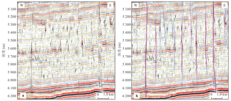 碳酸盐岩储层作为全球油气资源的重要载体,其内部溶洞和断裂系统的发育特征直接影响油气的储集与运移能力.针对深层-超深层碳酸盐岩储层中多尺度断裂预测的难题,研究以塔里木盆地塔河油田奥陶系碳酸盐岩为例,提出了一种基于地震波场特征分析的分类分级断裂预测技术.通过三维正演模拟揭示了规模缝洞体对常规断裂预测属性(如相干、最大似然)的干扰机制,发现缝洞体边界的“串珠状”反射异常会导致断裂假连通和归位偏差.基于断裂的尺度与溶蚀特征差异,将研究区断裂系统划分为大尺度破碎-溶蚀断裂(> 20 m)、中尺度弱-未溶蚀断裂(10~20 m)和小尺度裂缝(< 10 m),并分别开发了针对性的预测方法:针对大尺度断裂,提出基于梯度结构张量薄化的断裂归位技术,有效克服溶洞异常边界的干扰;针对中尺度断裂,结合AFE相干加强属性与U⁃Net深度学习算法,显著提升了断裂纵向连续性;针对小尺度裂缝,利用Likelihood属性与构造导向滤波实现弱反射信号的精准提取.进一步通过深度前馈神经网络(deep feedforward neural network,DFNN)融合多尺度断裂属性及钻井漏失数据,构建了井控多属性融合模型.应用结果表明,该技术体系在塔河油田复杂缝洞区实现了断裂系统的全尺度刻画,大尺度走滑断裂呈NNE⁃NNW向共轭分布,中尺度断裂形成花状构造,小尺度裂缝密集发育于断裂东侧主动盘.本研究为深层碳酸盐岩储层断裂预测提供了新的技术思路,对同类油气藏的勘探开发具有重要参考价值.
