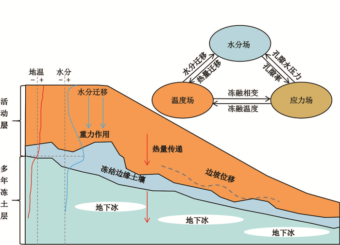 在全球气候变暖的背景下,加速退化的多年冻土降低了边坡稳定性,诱发热融滑塌等冻土灾害,严重威胁寒区的工程稳定性和生态环境安全.然而,当前学界对热融滑塌形态特征与演化过程的认知仍不充分,且模型模拟方法体系和适用性缺乏系统综述.因此,结合多年野外考察和文献资料,从热融滑塌的形态特征、演化过程、失稳机理和模拟方法4个方面进行了综述.研究发现:(1)热融滑塌形态特征可以划分为11种不同的类型,其空间分布与地形地貌、冻土环境条件和发育过程相关;(2)热融滑塌演化过程经历了地表裂缝、活动层剥离滑动、多旋回性退缩和逐渐趋于稳定等4个阶段,主要受到地下冰和极端气候事件影响;(3)热融滑塌失稳是热-水-力场相互作用的结果,应力场作用下影响水热传导,温度场和水分场决定空隙水压力来影响应力场,改变边坡稳定性;(4)极限平衡、数值模拟和不确定性是主要的冻土稳定性模拟方法,各有优缺点.本研究有助于认识和理解热融滑塌的现象和过程,对揭示冻土-气候-地貌交互机制具有重要意义,为寒区地貌学、冻土力学等学科理论体系的完善提供支撑.
