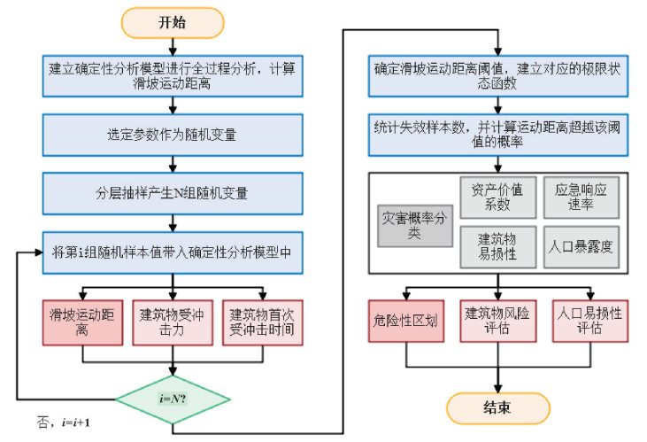 城市固废堆填形成的高陡边坡突发失稳常伴随大量建筑损毁和人员伤亡等灾害.为定量评估人工堆填滑坡的致灾风险,以深圳“12•20”光明滑坡为典型案例,采用基于深度积分法的Massflow软件构建动态数值模型,再现了滑坡失稳启动、高速运动及堆积的演进全过程.通过耦合滑坡物质冲击压力计算方法,定量评估了滑坡运动体对周边建筑物的冲击破坏效应,进而引入不确定性分析框架,将岩土体参数及滑动面特性视为随机变量,通过拉丁超立方抽样构建概率分析模型,揭示了多重因素影响下滑坡运动距离的统计特征,并建立了滑坡运动超越概率与建筑物冲击破坏效应间的关联模型.在此基础上,考虑承灾体易损性,对建筑物及其附近人员进行风险评价.研究结果表明:深度积分法有效捕捉了滑坡的动态演化特征,模拟所得滑裂面形态、运动距离(1 139 m)及堆积形态与实际监测数据高度吻合;滑坡运动物质对建筑物的冲击压力呈现先快速增大至峰值后逐渐衰减的规律,且峰值压力随距滑坡后缘距离增加而显著减小;通过基于参数不确定性的滑坡运动距离超越概率分析,实际堆积范围完全落于计算所得95%置信区间内,建筑物损毁区域与危险性区划结果高度匹配.本研究提出的耦合深度积分法与不确定性分析的承灾风险评价框架,为人工堆填滑坡的定量风险评估提供了新方法,对“无废城市”建设中的固废堆填安全保障具有重要理论价值与实践意义.
