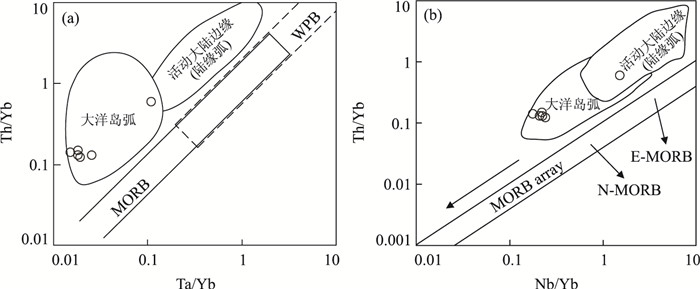 图 7 岩石的Ta/Yb-Th/Yb图解(a)和Nb/Yb-Th/Yb图解(b)