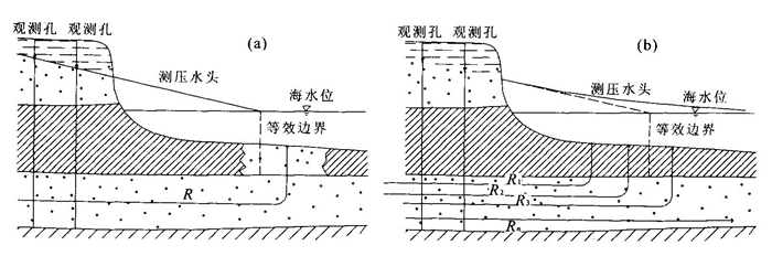 One of the main tasks in studying saltwater intrusion into coastal aquifer system is to determine the position of the saltwater-freshwater interface. For a natural confined aquifer, this position is related to the roof length of the aquifer extending under the sea. This information can be obtained from fluctuations of confined groundwater level caused by tidal effect of the sea. In the paper, taking account to the density difference between freshwater and seawater, a three-dimensional density-dependent tidal-effect model is developed in the Jiahe River basin, Shandong Province, China. The position of the aquifer roof extending under the sea, which is called the equivalent boundary toward sea, is determined by converging hydraulic head fluctuations data observed in the tidal-effect observation experiment. The aquifer parameters near the sea side are also estimated according to tidal fluctuation information.