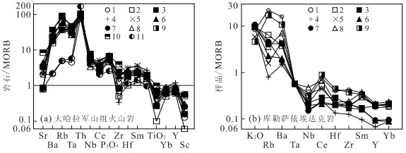 The volcanic rock assemblage of Dahalajunshan Formation is island arc calc-alkaline sodic volcanic rocks formed at plate convergent margins. The distribution of the volcanic rocks coincides with the anomaly of Au-Cu. All the gold-copper ore spots and mineralization spots in this area are volcanic rock-hosted of Dahalajunshan volcanic rocks,which show favorable ore-forming condition of gold-copper deposits. The gold mineralization is hosted in volcanic rocks mostly,and the epithermal gold deposit is the most significant type in this region. The Kulesayi porphyry is calc-alkaline hypabyssal rock,whose average SiO2 is 57.06%-70.74%,and they are rich in Al2O3,Na2O,Sr and LREE,poor in MgO,Y,Yb and very poor in HREE. With their Na2O/K2O of more than 1,Sr/Y of 57.67,and positive anomaly of Eu,they have characters of O-type adakite. The Kulesayi porphyry coincides with anomaly of Mo. Molybedenun deposit with good prospects for further exploration has been found here. The Kulesayi porphyry and Dahalajunshan volcanic rocks compose the assemblage of island arc volcanic rocks in Early Carboniferous,which enriches the tectonic rock association in this region,and is important for the geotectonic evolution study,regional metallogenic law exploration,and prospecting for the gold-copper deposit (relative to island arc volcanic rocks) and copper-molybedenun deposit (relative to adakite).