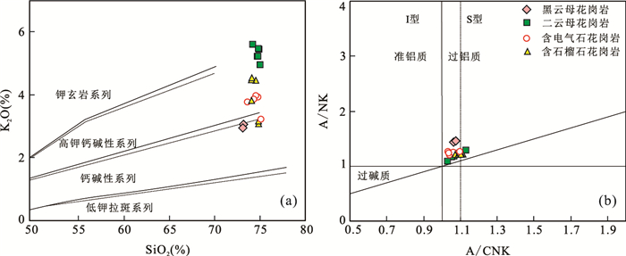 The leucogranite provides key insights into the tectonic evolution of orogenic belt. Petrology, geochemistry and geochronology results show that there are four types of leucogranites in the Xiaopu area in the southern piedmont of the Harlik area, eastern Tianshan, including the biotite leucogranite, two-mica leucogranite, tourmaline-bearing leucogranite and garnet-bearing leucogranite. These leucogranites are rich in silica (SiO2=73.22%-75.12%), aluminium (Al2O3=13.59%-14.49%), alkali(ALK=7.11%-9.67%), but low in titanium (TiO2=0.01%-0.14%), iron(TFeO=0.26%-1.37%), magnesium (MgO=0.09%-0.46%) and calcium (CaO=0.46%-1.92%), which belong to the calc-alkaline to shoshonite peraluminous granite. The high CaO/Na2O (0.46-0.47) and low Rb/Sr (0.31-0.33) ratios of the biotite leucogranite imply that it was formed by the biotite dehydration of greywacke, whereas the low CaO/Na2O (0.11-0.31) and high Rb/Sr (1.41-3.75) ratios indicate that the two-mica and tourmaline-bearing leucogranites were formed by the muscovite dehydration of meta-pelitic-arenaceous sedimentary rocks, and the strong negative Eu anomalies and "seagull forms" REE patterns reveal that the garnet-bearing leucogranite belongs to highly fractionated granite. Considered the geological features and low initial temperature (T=637-644℃), the Xiaopu leucogranites were probably formed related to the exhumation of deep material, or extensional collapse of the orogen. Zircon U-Pb results show that the formation ages of biotite and tourmaline-bearing leucogranites are 308.5±2.2 Ma and 307.8±2.3 Ma, respectively. Combining with the previous data, it is suggested that the Harlik area was in extensional tectonic setting in the Late Carboniferous.