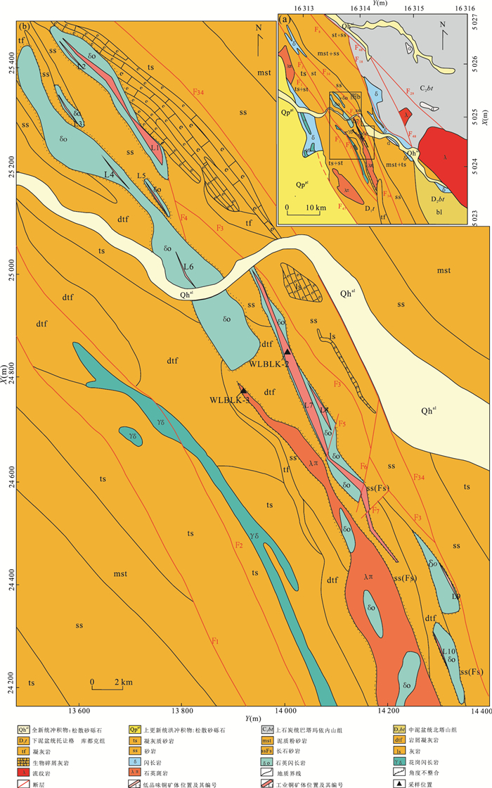 Wulunbulake copper deposit is located at the north-western segment of the Yemaquan-Qiongheba Cu-polymetallic metallogenic belt, East Junggar, Xinjiang. However, its genetic type and mineralizing age has been debated. This study presents new results on fluid inclusions and zircon U-Pb dating to precisely constrain the type and time of mineralization. The dominant fluid inclusions in Wulunbulake copper deposit are liquid-rich type, with low homogenization temperature (136.9-224.5℃), low salinity (1.7%~5.6% NaCl eqv.) and low density (0.97-1.01 g/cm3), the mineralizing pressure is 2.76×107-4.49×107 Pa and the corresponding depth is 1.04-1.95 km. The laser Raman spectroscopy results indicate that the ore-forming fluids consist of H2O, CH4, N2, H2. Zircon U-Pb dating results show that the formation age of ore-bearing quartz diorite and quartz porphyry is 440.5±3.3 Ma, and 419.7±3.3 Ma, respectively, indicating that there had experienced two-stage magmatic activities from Early Silurian. From the interior to the outer part of the deposit, there exist typical alteration zonation characteristics of porphyry deposits (silica alternation-potassic alternation-phyllic alternation-propylitization), and the geochemical characteristics of ore-bearing indicate that they were most possibly formed in arc setting. Its genetic type should be typical porphyry copper deposit and related to the southward subduction of the Paleo-Asian oceanic crust in the Early Silurian period. The East Junggar even northern Xinjiang was in the island arc environment in the Silurian, and the magmatic zone is a potential area for formation and prospecting of porphyritic Cu deposit.
