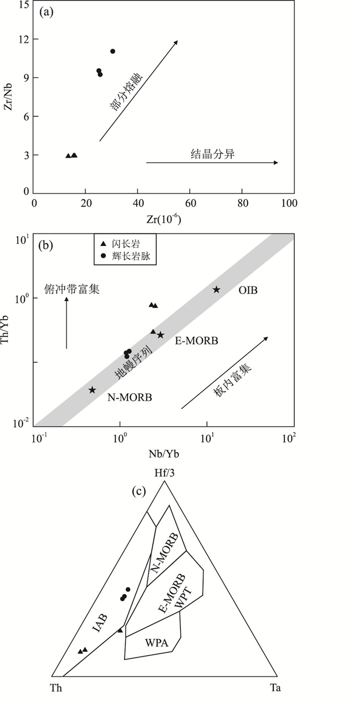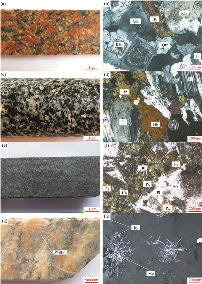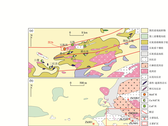 The Yuhaixi Mo deposit, located in the eastern part of the Dananhu-Tousuquan island arc belt, was discovered by the No.704 Geological Party of Xinjiang Geological Exploration Bureau for Nonferrous Metals in 2015. Rocks occurring at Yuhaixi contain the Carboniferous Yanchi Formation, Neogene Putaogou Formation and felsic-mafic plutons (gneissic granite, granite, diorite and gabbro dike). LA-ICP-MS zircon U-Pb dating reveals that gneissic granite and diorite replaced at ca. 364 Ma and 306 Ma, respectively. Yuhaixi intrusions are characterized by high εHf(t) (10.5-14.2) and εNd(t) (0.9-4.0) values, and low ISr (0.703 282-0.704 111) values, indicating depleted-mantle or juvenile-crust sources. The gneissic granite is characterized by low Mg# value (22-27), and Zr/Hf (28-33), Ti/Zr (10-29) and Ti/Y (94-149) ratios, implying a juvenile-crust source. The diorite and the gabbro dike are marked by low Si2O content (47.55%-57.54%), high Mg# values (51-59), and Ti/Zr (20-380) and Ti/Zr (246-269) ratios, which indicate that these rocks were likely formed by the part melting of the depleted mantle. However, diorite and the gabbro dike samples are rich in LREEs and LILEs (e.g., Rb, Sr), with low Ce/Pb ratios (6.5-12.0), suggesting the mixing of crustal component. Combining with the regional geological studies, the Yuhaixi gneissic granite was likely derived from the juvenile low crust, related with the north subduction of the Kangguer ocean plate; the diorite was also formed under a subducion setting by the partial melting of depleted mantle, and mixed with crustal component when it traversed the crust; the gabbro dike was probably derived from the depleted mantle, mixing with crustal component as well, in a post-collisional extension setting, the age of which was latter than 306 Ma.