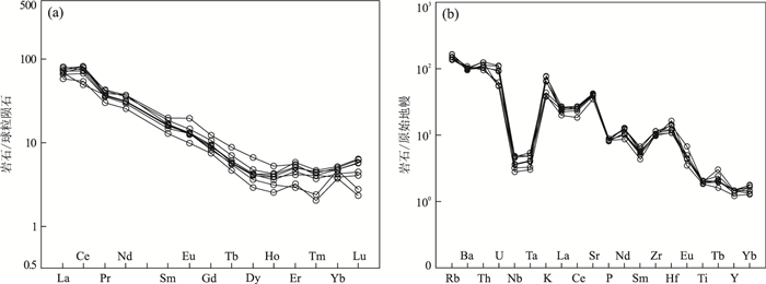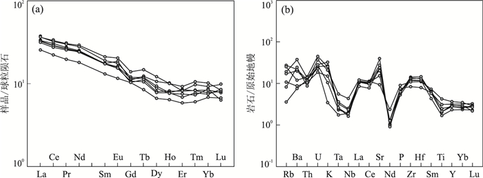 The Xiaojianshan gold depost is located in the Kanggurtag gold belt of the East Tianshan mountains, but the relationship between the mineralization and the intrusive rocks in the mining area is not clear. Based on the systematic study of petrography, petrogeochemistry and chronology, the results show that Xiaojianshan granite is dominated by adamellite, with SiO2 concentrations of 66.30%-68.31%, Al2O3 of 16.65%-18.28%, K2O of 3.25%-4.00%, Na2O of 2.38%-3.46%, and K2O/Na2O (0.94-1.68) with an average value of 1.41, belonging to peraluminous high-K cale-alkaline series. The granite is enriched in the light rare earth elements ((La/Yb)N values of 7.68-9.04) and LILEs like Rb and K, but is relatively depleted in the high field strength elements (Ta, Th, U, Nb and Ti). This granite has negligible Eu anomalies (δEu=1.02-1.25) and weak negative Ce anomaly (δCe=0.79-0.86). In the Nb-Y diagram, the samples all fall into the area of the volcanic arc-syncollisional granite; In the Rb-(Y+Nb) diagram, the samples fall into the area of volcanic arc granite; LA-ICP-MS zircon U-Pb dating shows that granite age is 257.0±2.3 Ma and formed in Late Permian and concordance with the extrusion strike slip structure and metallogenic time of the Kanggur gold belt. The Zr/Hf (31.90-37.60) and Nb/Ta (4.96-11.28) values of the samples show the characteristics of the partial melting of the crust, therefore, the granite is the partial melting product of the tectonic compression of the deep crust, and the emplacement process is closely related to gold mineralization.