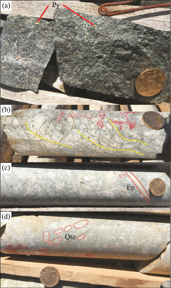 Jinba gold deposit is typical of the Ertix tectonic metallogenic belt, however, exsiting studies on its characteristics of tectonic alteration, evolution of ore-forming fluid and the source of hydrothermal fluid are insuffienct and the relationship between magmatic activity and Jinba gold deposit in the area is not clear. We carried out hydrothermal alteration, fluid inclusions and mineral sources based on the study of the geological characteristics of the deposit so as to provide useful information and reference for the genesis, mineralization and prospecting of Jinba gold deposit. It is found that sericitization, pyritization, silicification develop widely, which is an important sign of prospecting. Gold mineralization in the area is closely related to plagioclase granite and diorite, the drilling rock samples show gradual weakening mineralization and alteration from the center to the outside, with significant changes. The interpenetration texture and recrystallized texture characteristics of SEM-CL show that the deformation and metamorphism are very strong. And it has the characteristics of hydrothermal quartz. The hydrothermal mineralization is divided into four mineralization stages:magnetite quartz stage, gold-pyrite-quartz stage, gold-polymetallic sulfide-quartz stage, and quartz-carbonatation stage. Through the study on fluid inclusions, it is confirmed that the types of fluid inclusions in the Jinba gold deposit are:aqueous inclusions (LH2O-VCO2), CO2-H2O inclusions (LCO2-LH2O) and carbonic fluid inclusions. H2O and CO2 are the main ore-forming fluids in the gold deposit. There are two homogenization temperature peaks:260-280℃ and 380-400℃, with salinity from 0.88% to 13.72% Nacleqv and density from 0.90 to 0.95 g/cm3, so the fluid characteristics reflect that it is in medium-high temperature, low salinity and low-density environment. The composition of sulfur isotope present the ore-forming materials are derived from the deep crust. The data of δ18OH2O (1.49‰-5.31‰) and δDH2O (-78.0‰——80.5‰) suggest that meteoric water involves in the mineralization.