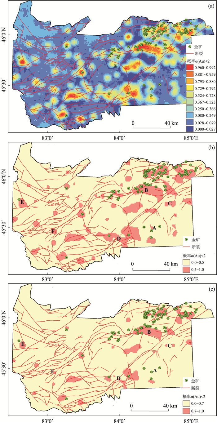 West Junggar belt, located in the core area of the Central Asian metallogenic domain, is one of the most important gold development bases in China. Accompanying intense tectonic and magmatic activities, extensive gold mineralization occurred during Paleozoic and a series of gold deposits/occurrences and mineralized points have been discovered in the West Junggar belt such as Sartohay, Hatu and Baogutu gold deposits. In the present study, the methods of local singularity analysis and sequential indicator simulation were employed to identify gold anomaly and model its uncertainty based on stream sediment geochemical data sampled from West Junggar belt, which allows for enhancing local and weak anomalies effectively. The results of simulation can be used to express probability distribution pattern of gold anomalies characterized by singularity indices less than 2. The results indicate that high probability zones of gold anomalies are closely associated with known gold deposits/occurrences, which provides an important decision-making for risk evaluation of gold resource exploration in the West Junggar belt.