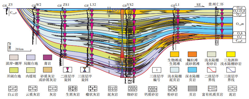 There are different understandings about lithofacies paleogeographic features of Ordovician in Sichuan Basin, and its synsedimentary paleo-uplifts need further research.Using the latest well, seismic data and field data, a study on the Ordovician lithofacies paleogeography on the basis of the sequence stratigraphic division and comparison is carried out.The Ordovician third-order sequence stratigraphic framework in the Upper Yangtze region was established, and the lithofacies palaeogeography of the key stratigraphic sequence was reconstructed.The study reveals that the sedimentary filling texture of Ordovician was controlled by second-order sequence stratigraphy.The strata thickness varies in the lower of each second-order sequence stratigraphy, indicating distinct fluctuant paleogeomorphology.Third-order sequence stratigraphy overlied toward the paleo-uplift region resulting in the loss of strata.The range of paleo-uplift was reduced at the late stage of second-order sequence, and the stratigraphic thickness of the third-order sequence was generally stable as the result of filling.The analysis of lithofacies paleogeography reveals that stable uplifts surrounded the central depressions from three sides, including the north, west, and south during Ordovician, and paleo-uplift in central Sichuan divided central depressions into two parts clearly.It is believed that the paleo-uplift in the central Sichuan and the paleo-uplift on both north and south sides are characterized by intermittent expansion.An uplift area exists during SSQ2 in the east of Sichuan.The central depression has the characteristics of continuous settlement and eastward migration.The study reveals that Early Ordovician Tongzi Formation had inherited the overall paleogeographic background of Loushanguan Group of Cambrian, forming two gypsum rock areas and dolomitization grain shoals distributed around paleo-uplift.In addition, delta depositions sourced from the west of study area maybe existed during Meitan period.