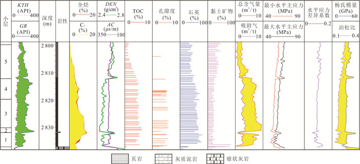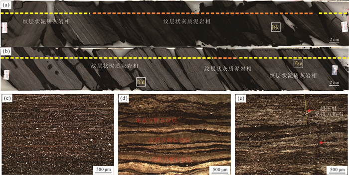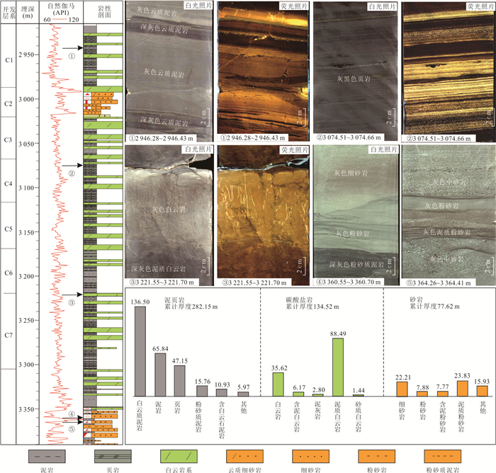 There are no relevant research results and technical methods on the classification of shale lithofacies combinations in continental faulted basins, and the basic characteristics of different shale lithofacies assemblages need to be further clarified. Based on the fine observation and description of the core samples, the basic rock and lithofacies types of the sampled shale sections were identified by observing rock thin sections and performing X-ray-based full-rock mineral diffraction analysis. By analyzing the major mineral composition and major and trace element contents of the samples, information about the sedimentary paleoenvironment of the Jiyang Depression was extracted. According to the basic characteristics of the four paleoenvironment factors (paleoclimate, paleosource, paleosalinity, paleowater depth), the shale stratigraphy of the Upper Sub-member of the Fourth Member of Shahejie Formation (Es4s) in the Dongying Sag was divided into lithofacies combinations based on the principle of sedimentary environment similarity and internal structure uniformity. A lithofacies combination classification scheme based on sedimentary environment control was established, and combined with reservoir and organic geochemical analysis, the main lithofacies combination reservoir and oil-bearing characteristics were clarified. Results show that: (1) Es4s shale in the Dongying Sag is a typical carbonate-rich shale (carbonate shale) and mixed shale, with significant lamination features, various types of pores, well-developed bedding and structural fractures, high organic matter abundance, moderate-to-low evolutionary degree, deep burial depth and high pressure coefficient. (2) Based on sedimentary structural position and paleoenvironment, the Es4s shale in the Dongying Sag can be divided into 8 lithofacies combinations. In the central part of the basin, the matrix carbonate shale lithofacies combination is dominant, with some interbedded block dolomite shale lithofacies combination. In the northern steep slope belt, the sandstone interbedded shale lithofacies combination is mainly developed, and in the southern gentle slope belt, the block dolomite shale interbedded lithofacies combination and the laminar carbonate mudstone and dolomite shale interbedded lithofacies combination are mainly developed. (3) In general, as the main body of fine-grained sediments, the Es4s matrix shale stratigraphy in the center of the Dongying Sag develops from bottom to top: laminar carbonate shale interbedded with block dolomite shale lithofacies, laminar carbonate shale and dolomite shale interbedded lithofacies, laminar carbonate shale and carbonate mudstone interbedded lithofacies, laminar carbonate shale interbedded with carbonate mudstone lithofacies, laminated carbonate shale and carbonate mudstone interbedded lithofacies, laminated carbonate shale interbedded with carbonate mudstone lithofacies, etc., revealing the change in sedimentary paleoenvironment from arid, brackish water, semi-deep water, and less source rocks to semi-wet, semi-brackish water, deep water, and more source rocks. (4) The laminar carbonate shale interbedded with carbonate mudstone lithofacies combination and the laminar carbonate shale and carbonate mudstone interbedded lithofacies combination are the most developed, with a variety of reservoir space types, high proportion of large-diameter pores and good connectivity. The laminar carbonate shale and carbonate mudstone interbedded lithofacies combination has relatively high oil saturation, and is also a favorable lithofacies combination type for achieving breakthroughs in shale oil in the Jiyang Depression. The laminar carbonate shale interbedded with block-type dolomite shale lithofacies combination has good oil-bearing and brittle properties. Further analysis of the basic geological characteristics and oil-bearing characteristics of different lithofacies combinations and determination of the development and distribution characteristics of the main shale lithofacies combinations are of practical significance for exploring shale oil in continental faulted basins.