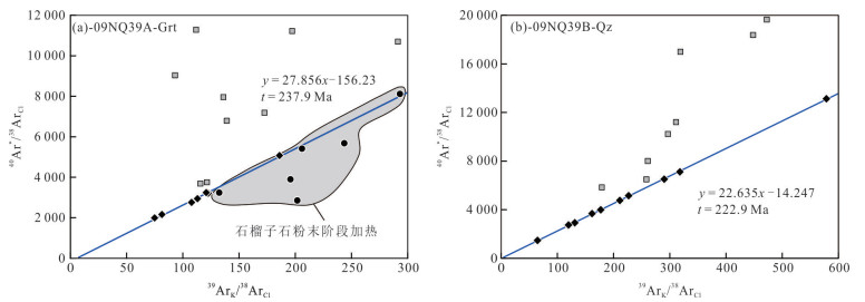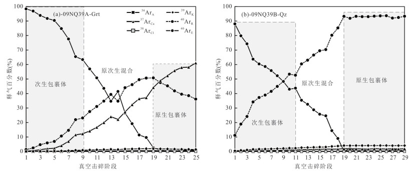 One garnet sample from an extensively retrogressed eclogite and a quartz vein located at the boundary between the host gneiss and the eclogite lens from the Xitieshan terrane, North Qaidam, western China, have been analyzed by joint 40Ar/39Ar in vacuo crushing and stepwise heating techniques. The results provide significant information to directly constrain the origin and timing of hydrothermal fluid flow activity, as well as the age of the vein-forming. The stepwise heating result could further be used to decipher the hydrothermal alteration history of the ultrahigh pressure (UHP) metamorphic rocks. Garnet sample analyzed by in vacuo crushing forms a falling-down age spectrum and yields a relatively flat age plateaus for the last 7 steps (19 to 25) with a plateau age of 226.3±3.9 Ma (2σ). These data points constitute the plateau age yielding an excellent isochron with an isochron age of 222.6±16.7 Ma and initial 40Ar/36Ar ratio of 297±6. The crushed powders of the garnet yields, with further stepwise heating, a flat age spectrum with plateau age of 212.0±9.0 Ma, which defined a good isochron with an age of 212.1±8.1 Ma and initial 40Ar/36Ar ratio of 296±1. These results illustrate that the Xitieshan eclogites and their retrogressed equivalents were intensively overprinted by hydrothermal event in the Late Triassic. Quartz samples dated by 40Ar/39Ar in vacuo crushing method yield monotonic declining release patterns: anomalously old apparent ages are obtained at the first steps and relative flat age plateaus of 222.8±1.2 Ma over the final several steps. The gases liberated in the final steps are most derived from radiogenic and trapped argon in small primary fluid inclusions and pseudo-secondary fluid inclusions and also atmospheric argon from the crusher. The plateau age is interpreted as the best estimate for the age of quartz veining formation, witnessing a significant aqueous fluid flow episode during the Late Indosinian Period. Microthermometry analyses and 40Ar/39Ar in vacuo crushing dating suggest that the secondary inclusions may be originated from the extraneous 40Ar rich post-hydrothermal fluid from the depth. In contrast, it hypothesizes that these fluids of primary fluid inclusions mainly derived from meteoric waters transported by regional ductile fault/shearing zones and permeable schistosity. The garnet and quartz vein crushing results also suggest that the structurally-controlled fluid-rock interaction and rock metasomatism, resulting in that eclogites are extensively retrogressed and UHP metamorphic indicator minerals (such as coesite and diamond) are rarely preserved in the Xitieshan terrane.