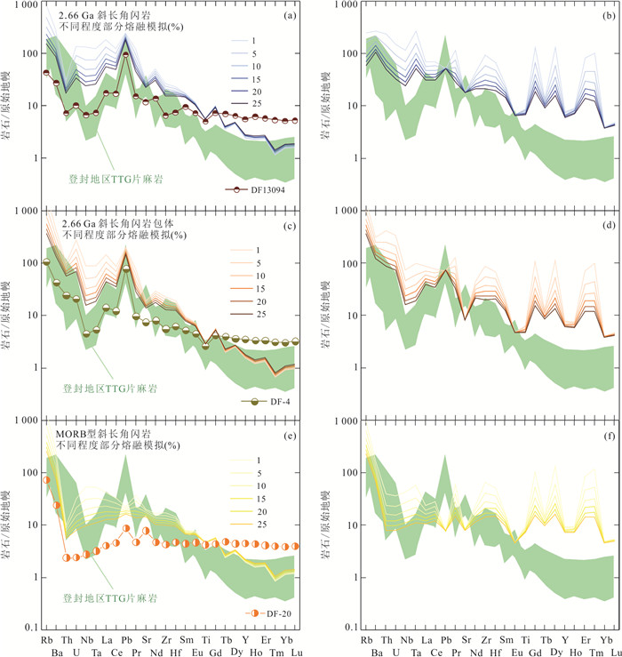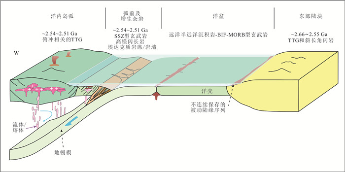 Tonalite-trondhjemite-granodiorite (TTG) is the most important component of the early continental crust of the Earth, which is closely related to the early tectonic environment and crustal differentiation process. By means of petrography, rare earth element differentiation, U-Pb age and Hf model age of zircon and trace element simulation based on the partial melting degree, this paper defines the protolith of TTG gneiss in Dengfeng area and its residual phase during partial melting. Meanwhile, zircon U-Pb dating shows that Dengfeng complex recorded two TTG magmatism (2.57-2.55 Ga and 2.55-2.51 Ga). TTG in Dengfeng complex has high εHf(t) and εNd(t) values (1.7-9.7 and 0.23-3.87), which are close to the depleted mantle values of the same period. In addition, TTG gneiss has high SiO2, Na2O, La/Yb and Sr/Y ratios and low Mg#, Cr, Ni, Yb, and Y contents. These data indicate that the rocks in the Dengfeng area represent the main components of mature crust. It is suggested by various data, including rock types, structural patterns, and geochemistry, that the greenstone belt combination (metamorphic volcanic sedimentary rocks) within the Dengfeng complex is forearc and accretionary terranes. The TTG-dominated Dengfeng complexes in the eastern and western parts may represent the island arc's core, and they collectively constitute the signature product of plate convergence. Further simulations of trace elements indicate that TTG gneisses in the Dengfeng area were partially melted from hydrated basaltic (amphibolite) rocks of the subducted oceanic crust, leaving behind garnet-bearing amphibolite residues. As such, we can infer that there was significant growth of young crust during this period, and the late Neoarchean TTG gneiss (2.57- 2.50 Ga) found along the southern margin of the North China Craton provides evidence to the formation of a new continental crust.
