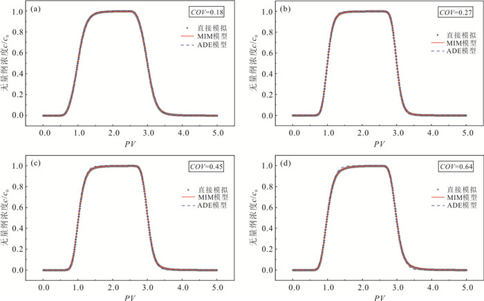 The contaminant transport in porous media is crucial for a comprehensive understanding of groundwater contamination. However, there are still inadequacies in the research concerning the effect of the coefficient of variation (COV) of particle size of porous media on the contaminant transport in the internal microscopic pore structure. A method is proposed to construct a geometric model of porous media with different coefficients of variation and consistent porosity based on a random algorithm. The groundwater flow field and contaminant concentration field in porous media are obtained by coupling the Navier-Stokes equation and the advection-diffusion equation. The uniformity of flow velocity distribution is evaluated quantitatively by introducing Christiansen uniformity coefficient. Based on the MIM (mobile and immobile) model and the ADE (advection-dispersion equation) model, the characteristics of breakthrough curves are analyzed. The results show that as the COV of particle size increases, the non-uniformity of the flow velocity distribution is enhanced. The COV of particle size is positively correlated with the ratio of solute mobile domain\begin{document}$ \beta $\end{document} and the dimensionless mass transfer rate \begin{document}$ {\alpha }^{*} $\end{document} ; the goodness-of-fitting of MIM model is better than that of ADE model, and as the COV increases, the fitting global error \begin{document}$ {E}_{\mathrm{i}} $\end{document} of ADE model gradually increases. Overall, the COV of particle size controls the size of mobile and immobile domain and solute exchange intensity between two domains, resulting in the non-Fickian behavior of solute transport in porous media. This also causes the error of ADE model gradually increases. MIM model has better applicability for the porous media with larger COV.