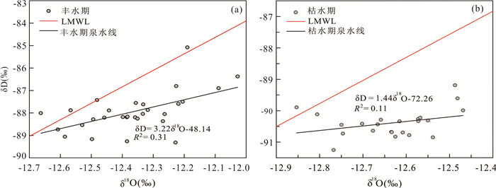 In order to explore the recharge mechanism of karst spring. Based on the data of hydrogen and oxygen stable isotopes monitored from April 2017 to December 2020 in Huanglong spring catchment monitored from April 2017 to December 2020, the models of unary linear regression, multiple linear regression, and trigonometric regression were used to explore the characteristics of hydrogen and oxygen stable isotopes, hydrology, and conductivity changes in the spring waters and their coupling relationships to reveal the process of spring recharge sources. The results show that: (1) The δD and δ18O values of spring water and river water were greater in the wet period than in the dry period, and the δD and δ18O values of cave drip water and stream water were similar to the stable isotope value of regional atmospheric precipitation, which were greater in the dry period than in the wet period. (2) The d-excess values of the spring catchment were greater in the wet period than in the dry period, and the water level, δD, δ18O and conductivity of the spring produced a seasonal coupling response to precipitation, and the recharge process of spring was influenced by the "piston effect" of the karst system and the "dilution effect" of the precipitation. (3) The seasonal characteristics of δD and δ18O of cave drips show that the drips inside the cave were larger than those near the cave entrance; the time sequence of troughs in the δD cosine function of the spring domain: stream water > cave drips > river water > spring water, and the response time to atmospheric precipitation was successively delayed. (4) The spring was recharged by the perennial mixture of infiltration of atmospheric precipitation and the weathering fissure water flowing from non-karst areas. The analyses of the characteristics of hydrogen and oxygen isotopes, hydrologic dynamics, runoff process and recharge mechanism in karst region have important reference significance for the control, management and protection of water resources in karst area.