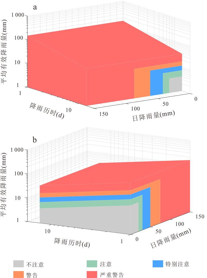 The establishment of the multi-dimensional meteorological early warning criterion of landslide and the division of the "grid" early warning unit can provide a scientific basis for the landslide early warning, for the purpose of which 205 rainfall-induced landslides in Panan County, Zhejiang Province were studied in this paper. Firstly, based on the average effective rainfall intensity-diachronic (I-D) threshold model, the critical threshold curves were divided by ordinary least squares regression (OLSQ) and quantile regression (QR). Secondly, the I-D-R threshold model was established by the I-D threshold model optimized by considering the daily rainfall (R), and different parameter estimation methods were used to compare the accuracy of different threshold models. The optimal threshold model was considered as the meteorological early warning criterion for landslide disasters in Pan'an County. Finally, considering the difference of rainfall distribution, the township level grid early warning unit was established by the terrain zoning and Voronoi diagram (VD) of Pan'an. The results show that: (1) The I⁃D⁃R threshold model has better early warning accuracy than the I⁃D model. The I⁃D⁃R threshold model based on QR has a better warning ability, and the accuracy of the threshold degree of warning and above is increased to 50%, and the accuracy of the threshold level of special attention and above is increased to 88.9%; (2) the rainfall conditions with I⁃D⁃R based on QR rainfall threshold are proposed as the early warning criteria (red, orange, yellow and blue) of 51 early warning units in Pan'an County, and the emergency response measures are put forward. A new threshold model is established on the basis of the research results, which can provide reference for regional meteorological early warning in Pan'an County.