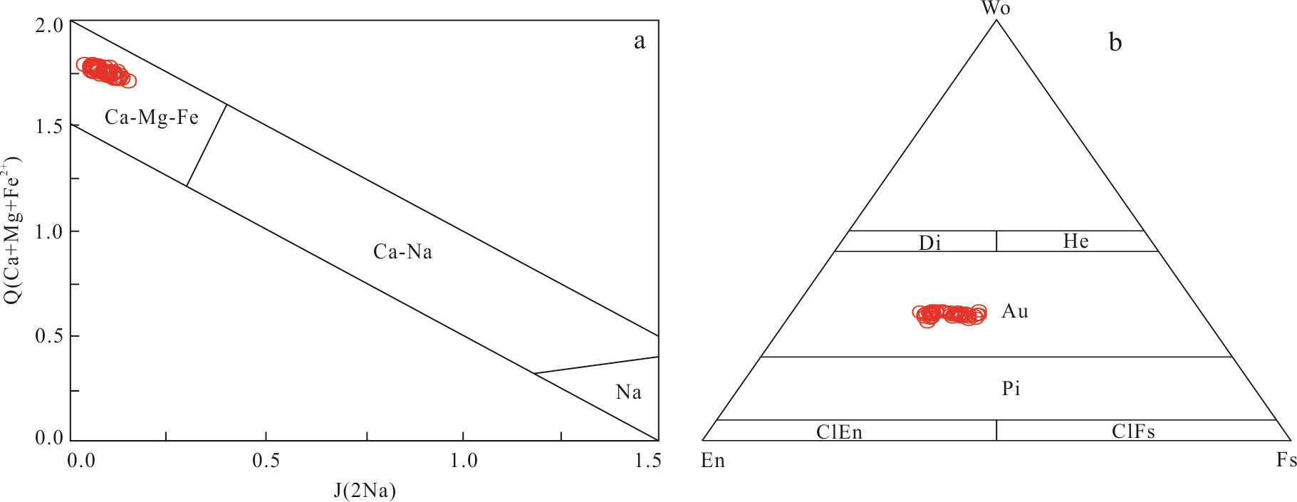 In this paper, the geochronology, mineralogy and mineral chemistry of Luojiashan gabbro in Yingyangguan area of northeastern Guangxi were studied, to constrain the regional tectonic background. The main mineral compositions of Luojiashan gabbro are clinopyroxene (Cpx) and plagioclase (Pl). The clinopyroxene of Luojiashan gabbro is characterized by high Fe, Al, and low Ca, Na, Ti, and its composition is Wo27-31En36-47Fs21-32, which belongs to augite. Plagioclase is characterized by high Si, Al, Na, and low Ca, K, and its composition is An0-3Ab96-100Or0-2, which belongs to albite. According to the chemical composition of clinopyroxene, the parental magma of the Luojiashan gabbro should belong to tholeiitic series. The crystallization temperature and pressure of clinopyroxene were estimated by the clinopyroxene-melt equilibrium and clinopyroxene isotherm, which yielded crystallization temperature of 1 282-1 292 ℃, with an average of 1 287 ℃. The pressures are 1.53-2.37 GPa, with an average of 2.02 GPa, and corresponding to a formation depth of 50.49-78.21 km, with an average of 66.80 km. The Luojiashan gabbro was formed at (768.9±6.8) Ma based on LA-ICP-MS zircon U-Pb dating. The chemical composition of clinopyroxene indicates that Luojiashan gabbro is a typical intraplate tholeiite. Combined with the characteristics of regional tectonic evolution, it is inferred that the Luojiashan gabbro in northeastern Guangxi originated from the extensional rift tectonic background of lithosphere thinning and mantle upwelling.