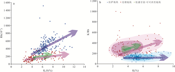 Post-collisional potassic-ultrapotassic volcanic rocks are widely developed in the Lhasa block, Qiangtang block and Songpan-Ganzi-Kekexili block in the Qinghai-Xizang region. Many previous studies on the potassic-ultrapotassic volcanic rocks in this area show the supernormal enrichment of trace alkali elements such as Rb and Cs in the Lhasa block is much higher than those in other two blocks. In order to quantify this phenomenon and to investigate the causes of enrichment, this paper quantifies the enrichment degree of trace alkali elements in the three blocks, and has attained a preliminary understanding of the causes of enrichment, based on the measured and published data, using statistical methods such as box-plot and systematic mineralogical and geochemical analysis methods, It is concluded that the high degree of magmatic differentiation in the potassic-ultrapotassic volcanic rocks of the Lhasa block is the main cause of the rare alkali elements enrichment of Rb and Cs, and the enrichment zones are mainly located in the central and western part of the Lhasa block, where the volcanic rocks range in age from 25 to 13 Ma. The discrimination range of Zr/Hf and Nb/Ta with high degree of differentiation of potassic-ultrapotassic volcanic rocks in the Lhasa block is also delineated by analogy with the results of highly differentiated granites.