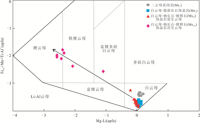 The Dahongliutan two-mica granite is considered as parental rock to the adjacent pegmatite-type lithium deposits such as Bailongshan. To constrain the magmatic-hydrothermal evolution of granite and associated pegmatites, we selected the penetrative minerals, mica and tourmaline, from two-mica granite and pegmatite with different degrees of mineralization, for backscattering observation (BSE) and electron probe microanalysis (EPMA). In the two-mica granite (Ms1) and muscovite-microcline pegmatite (Ms2), the muscovite is homogeneous, with limited chemical variations. In muscovite-albite-spodumene pegmatite, the muscovite (Ms3) incorporates much higher Li (Li2O up to 4.68%) and F (up to 6.47%) in comparison to Ms1 and Ms2. There are additional Li-bearing phengite, zinnwaldite and lepidolite that have replaced muscovite. Tourmalines from two-mica granite (Tur1) and muscovite-microcline pegmatite (Tur2) belong to alkaline schorl, while those from spodumene pegmatite (Tur3) are alkaline elbaite. Compared to alkaline schorl, alkaline elbaite is enriched in SiO2, Al2O3, Li2O, but depleted in TiO2, MgO and CaO. The textural and compositional features of mica and tourmaline reveal that the two-mica granite and muscovite-microcline pegmatite were formed by magmatic process, without lithium mineralization. By contrast, muscovite-albite-spodumene pegmatite was formed during the magmatic-hydrothermal transition, where lithium was significantly enriched, and numerous lithium-rich minerals such as spodumene, lithium-rich polysilicon muscovite, Li-bearing phengite, zinnwaldite, lepidolite and elbaite, were precipitated. Accordingly, we propose that the magmatic-hydrothermal transition is of great significance for lithium mineralization. In pegmatite-type deposits, the presence of elbaite and lepidolite indicates high degree of magmatic evolution.