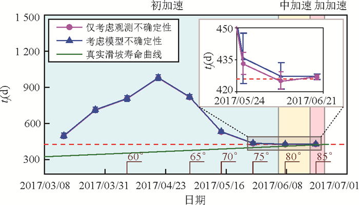 Landslide time-of-failure forecast is an essential part of landslide disaster prevention and control. However, due to the uncertainty of the landslide evolution process, it is challenging to forecast the occurrence time of landslide events accurately. The Verhulst inverse-function model is a common landslide time-of-failure forecasting model, but the model suffers from the problems of poor fitting quality and low forecasting accuracy of displacement monitoring data caused by the improper selection of the calculation starting points. To address this deficiency, an improved Verhulst inverse-function model (MVIF model) is proposed and analyzed for near real-time probabilistic forecast.The results show that (1) the MVIF model addresses the problem of harsh selection of the calculation starting points in the original model; (2) the MVIF model has high forecasting accuracy and can make reliable forecasts after the landslide enters the medium accelerating deformation phase; (3) the combination of predicted landslide time and failure probability provides a new forecasting criterion. This study can provide valuable reference for early warning and forecast of creeping landslides.