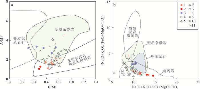 Garnet bearing granodiorite in the Jianfengshan area on the northern margin of Qaidam basin is vein distributed in Dakendaban rock group. The rocks are mainly composed of quartz (30%-35%), plagioclase (45%-50%), potassium feldspar (15%-20%), biotite (5%) and a small amount of muscovite (< 5%), garnet (< 5%).Zircon U-Pb dating shows that the formation age of garnet bearing granodiorite is (441.1 ± 1.4) Ma, belonging to Early Silurian.The rocks have high SiO2 (66.27%-74.42%), Na2O (3.47%-6.75%), Al2O3 (14.71%-20.43%), low MgO (0.07%-0.56%), Mg# (19.8-43.6) contents and strong peraluminite (A/CNK ranges from 0.99~1.34).The minerals are enriched in U, K, Ba and depleted in Nb, Ta, Sr, P, Eu, Ti and other elements. The REE distribution curves show a right-leaning pattern, showing a weak negative Eu anomaly (δEu= 0.31-0.81). The rocks have high ISr values (0.707 123-0.708 081) and negative εNd(t) values (-1.91 to -2.37), and the two-stage model age TDM2 is 1 660-1 756 Ma. After correction, (206Pb/204Pb)i value is 18.354 7-18.582 2, (207Pb/204Pb)i value is 15.365 4-15.641 2, (208Pb/204Pb)i value is 38.254 7-38.654 1. Zircon Hf εHf(t) ratios range from 2.5 to -9.1, and the corresponding Hf isotopic crust model ages TDM2 range in 1 263-2 012 Ma. The study of rock geochemistry and isotopes shows that the garnet bearing granodiorite in the Jianfengshan is an S-type granite, which was formed in the collision orogenic stage between Qaidam block and Qilian block. It is the early subducted continental and oceanic crust that experienced ultra-high pressure metamorphism (eclogite facies conditions) and the rise of partially molten fluid, resulting in the partial melting of the continental crust.