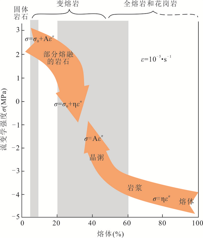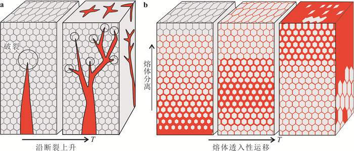 Anatexis is significant for the evolution and rheological properties of the continental crust, linking metamorphism, tectonic deformation, and magmatic activities in deep crust. According to the presence or absence of free water, anatexis can be divided into water-fluxed melting and dehydration melting. Dehydration melting involves the breakdown of hydrous phases, such as muscovite, biotite or amphibole. Generally, dehydration melting reactions begin at ~650 ℃ and produce melt, peritectic garnet and K-feldspar. Melt resulting from dehydration melting is water unsaturated, characterized by high Rb, high Rb/Sr ratio, high 87Sr/86Sr ratio, and low Sr, Ba, Ca. Melt productivity of dehydration melting reaction is controlled by P-T condition and water content in rock, and it is only possible to produce a large amount of melt at granulite facies. Water-fluxed melting reactions involve the presence of free water. Its most significant feature is that the temperature required is relatively low, and can produce voluminous melting at amphibolite facies. The resulting melt is water-saturated or water unsaturated that can extract from the source. Melt derived from water-fluxed melting reactions has high Sr, Ba, Ca, low Rb/Sr ratio and low Rb. Anatexis has a profound impact on the thermodynamic and rheological properties of the rocks. At the same time, the movement of melt out of the lower continental crust promotes the chemical differentiation of the crust and forms a wide range of leucogranite, playing a crucial role in the origin, reworking, and stability of the continental crust.